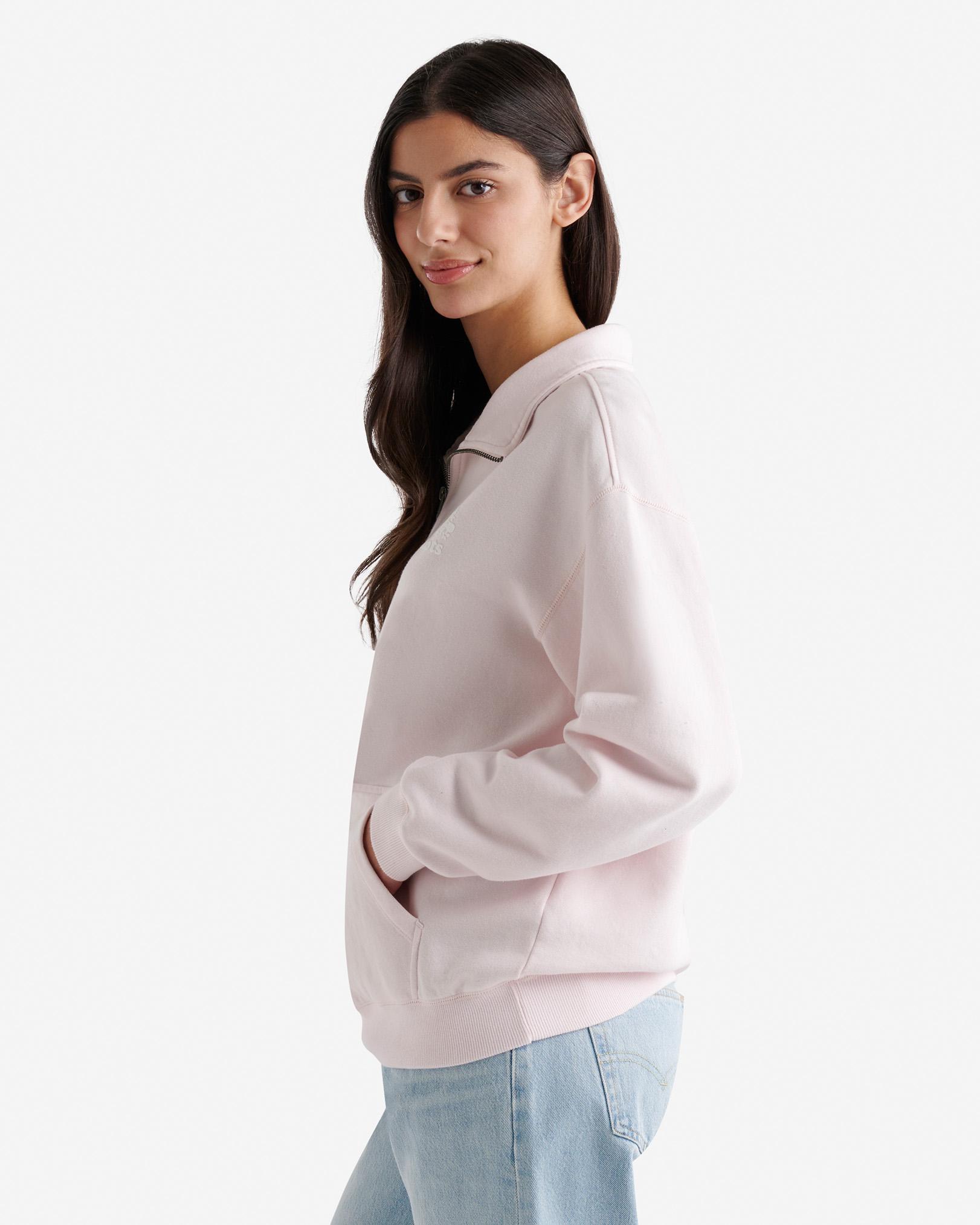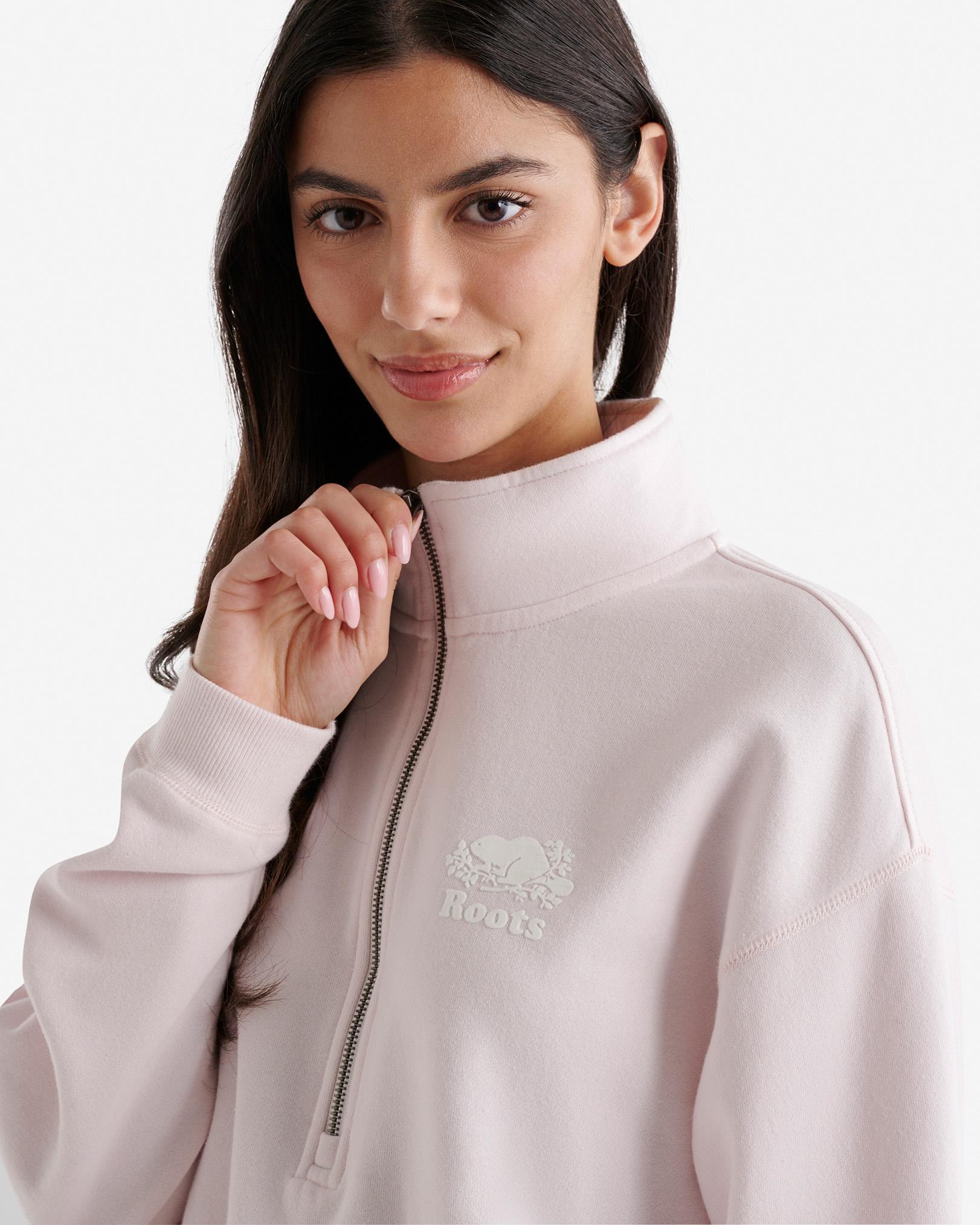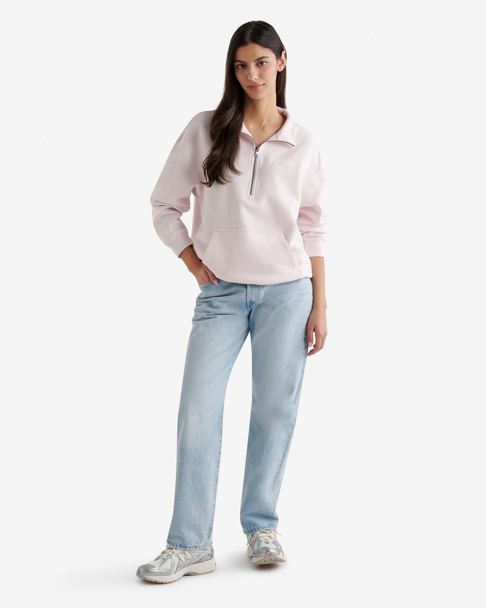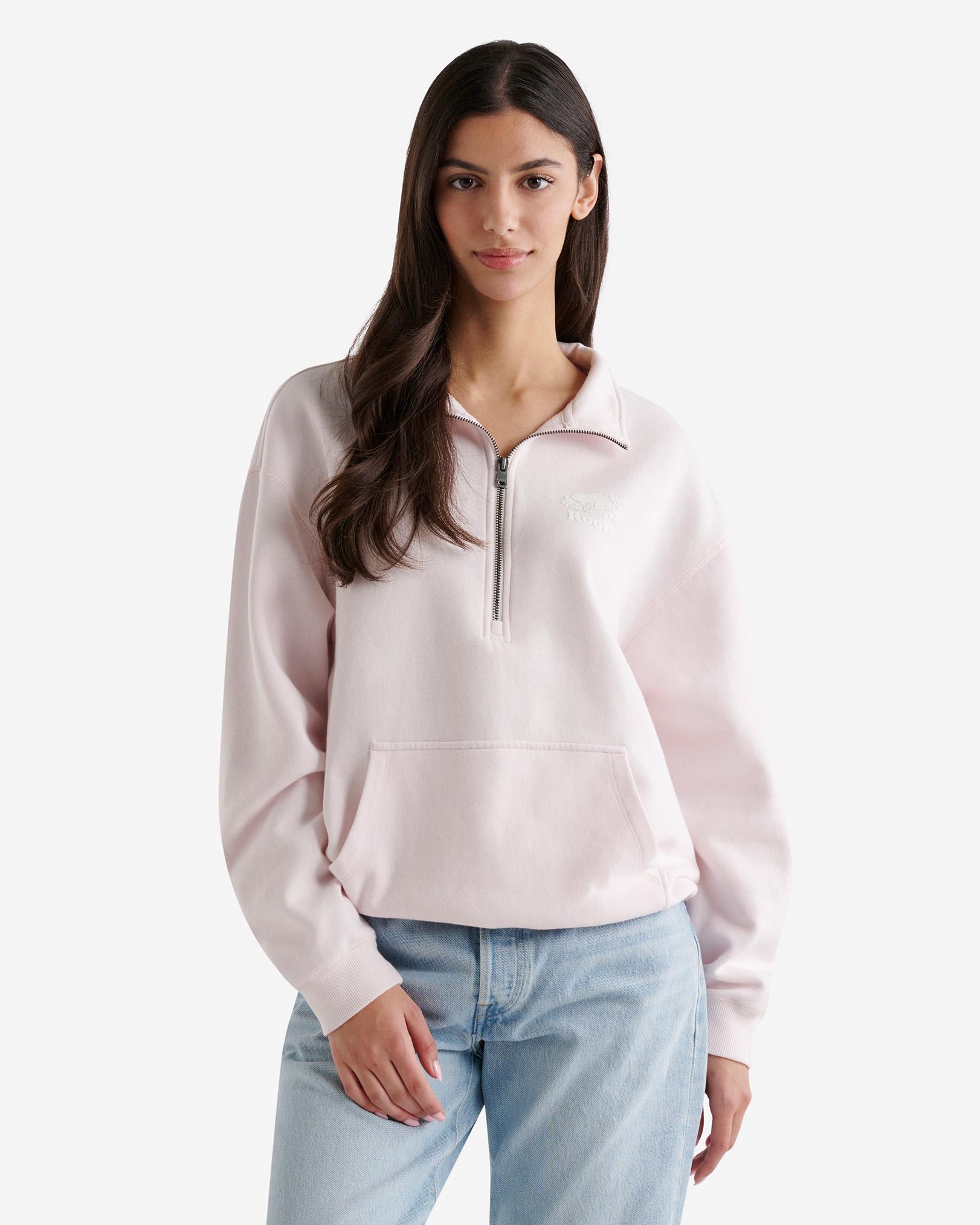 Be comfy everywhere in our Organic Cooper Relaxed Half Zip Stein. With a relaxed fit and convenient kanga pocket for your on-the-go essentials, this sweatshirt is made for chilling. Organic cotton & recycled materials Relaxed fit Dropped shoulder Front quarter zip closure Ribbed body band & sleeve cuffs Flocked iconic logo at front left ABOUT 80% organic cotton, 20% recycled polyester fleece SIZE & FIT The model is wearing a size small Model Measurements: Height: 5'9 ; bust: 34B"; waist: 25 ; hips: 35 RELAXED FIT The relaxed fit falls away from the body for a more casual look and feel. LOOK AFTER ME Reverse garment before washing or ironing Machine wash cold, gentle cycle with like colours No bleach Tumble dry low - low iron Do not iron decoration Do not dry clean Roots Organic Cooper Relaxed Half Zip Stein Shirt in Pink Pearl