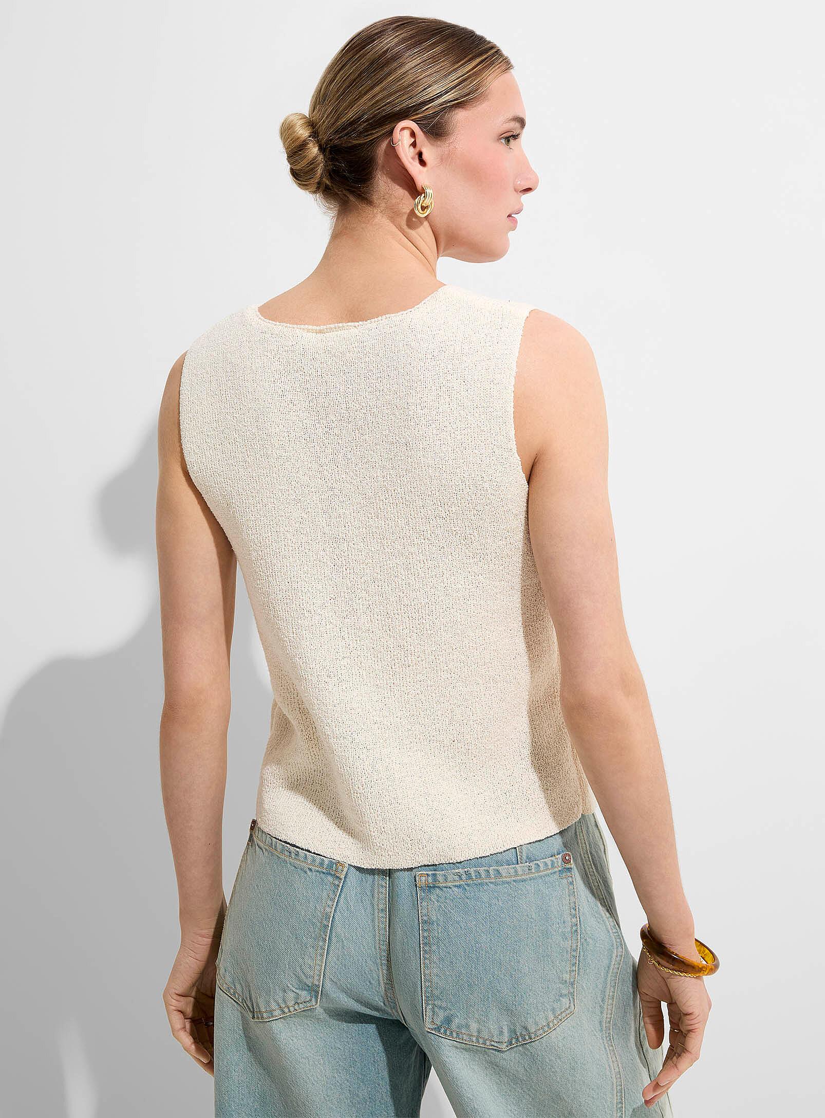 ICHI - Pearly buttons terry knit vest ICHI ICHI at Icône Ultra-supple and stretch terry knit made from recycled polyester Regular sleeveless fit Crew neck Pearly shell-like buttons The size of the item pictured is small