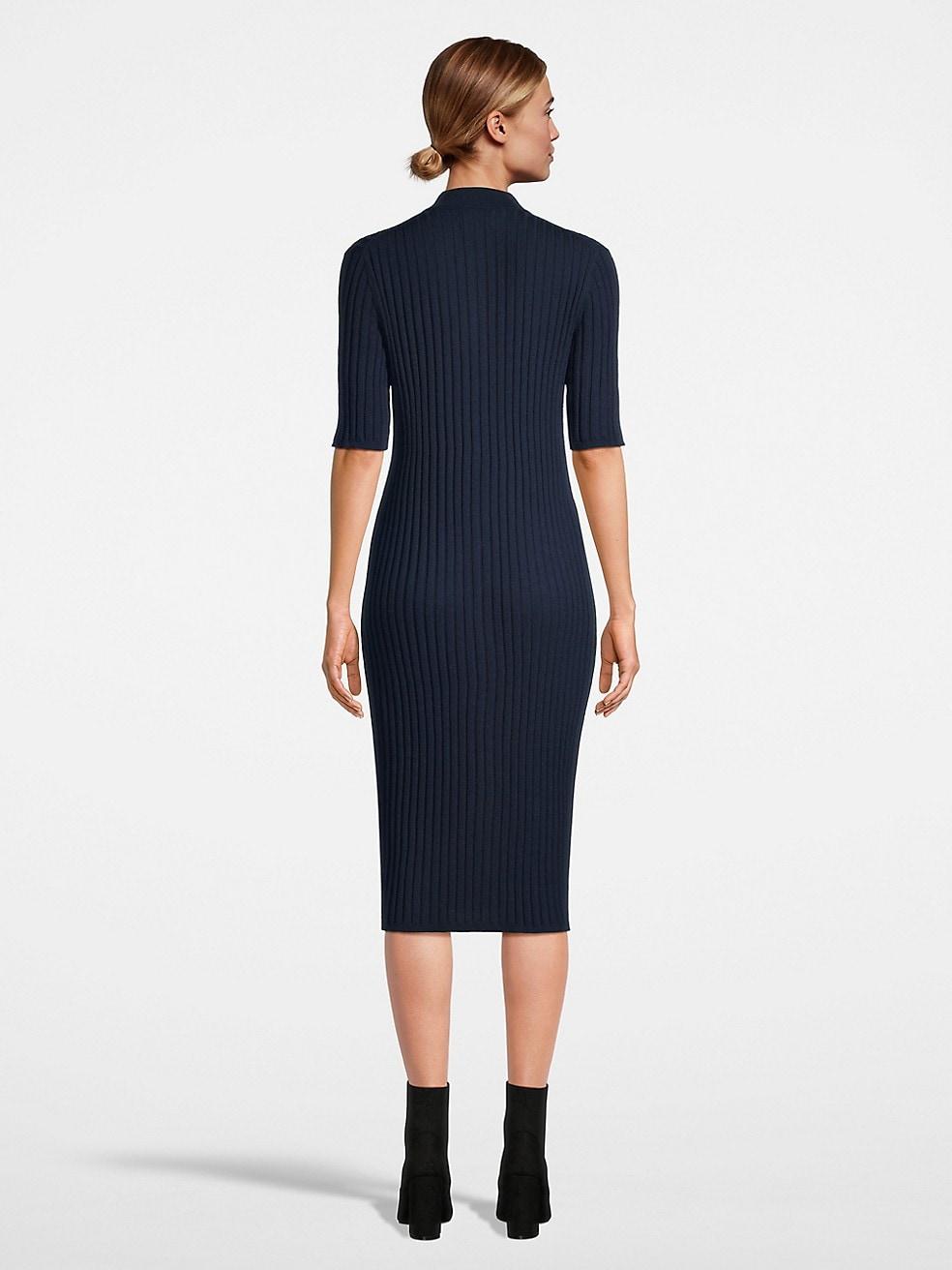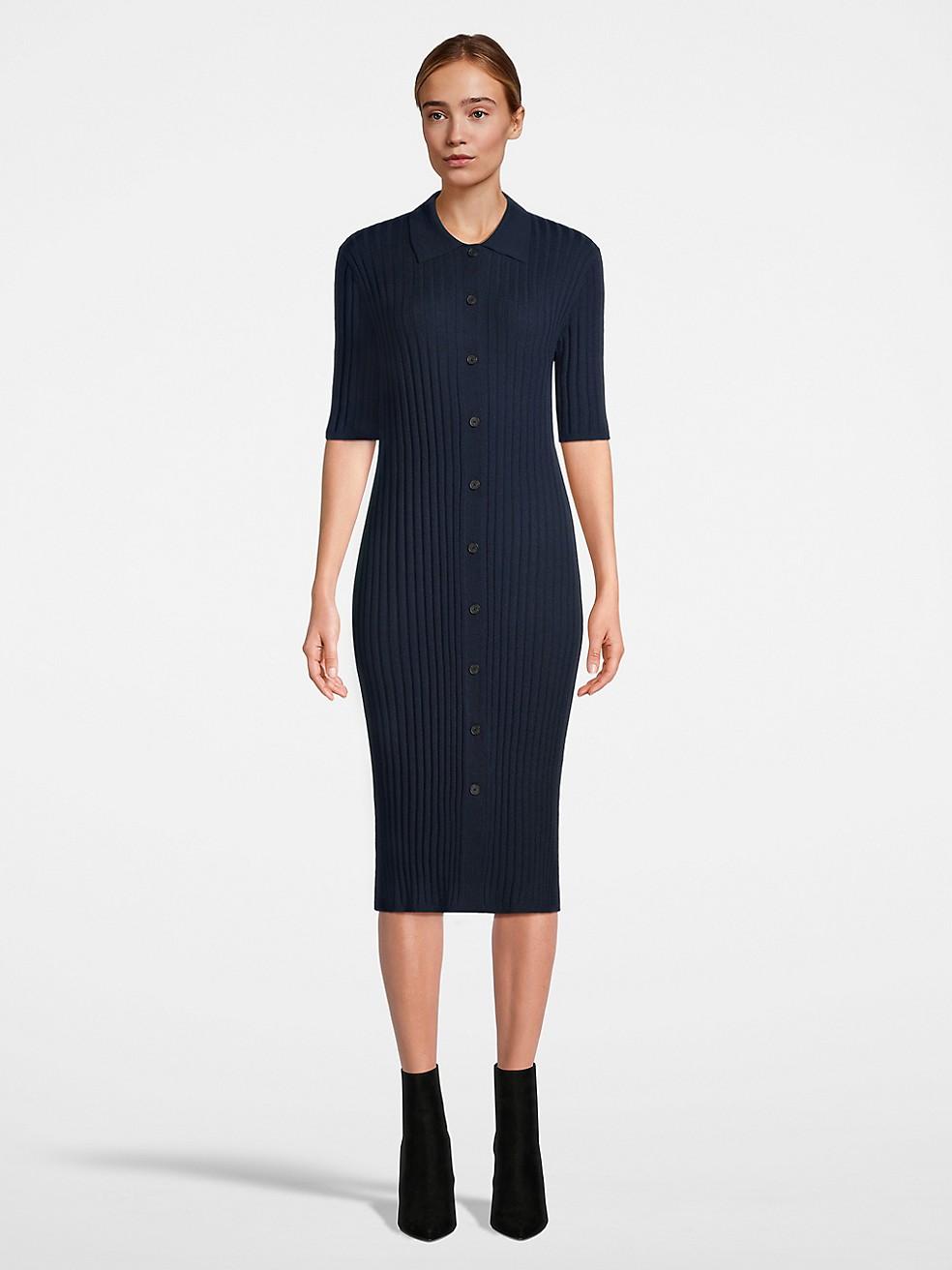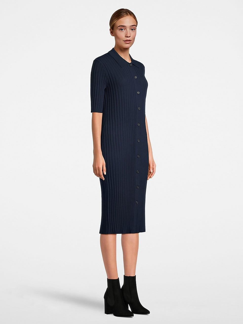 This fully-fashioned midi dress features a knit collar and button front. Known for its natural warmth and supersoft feel, extrafine Woolmark certified Merino wool is knit into a rib stitch for a fitted feminine look.