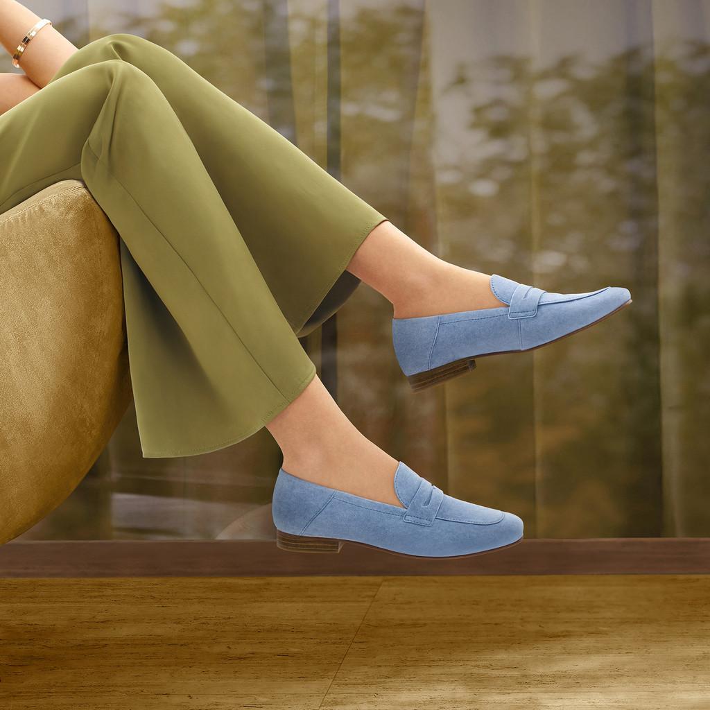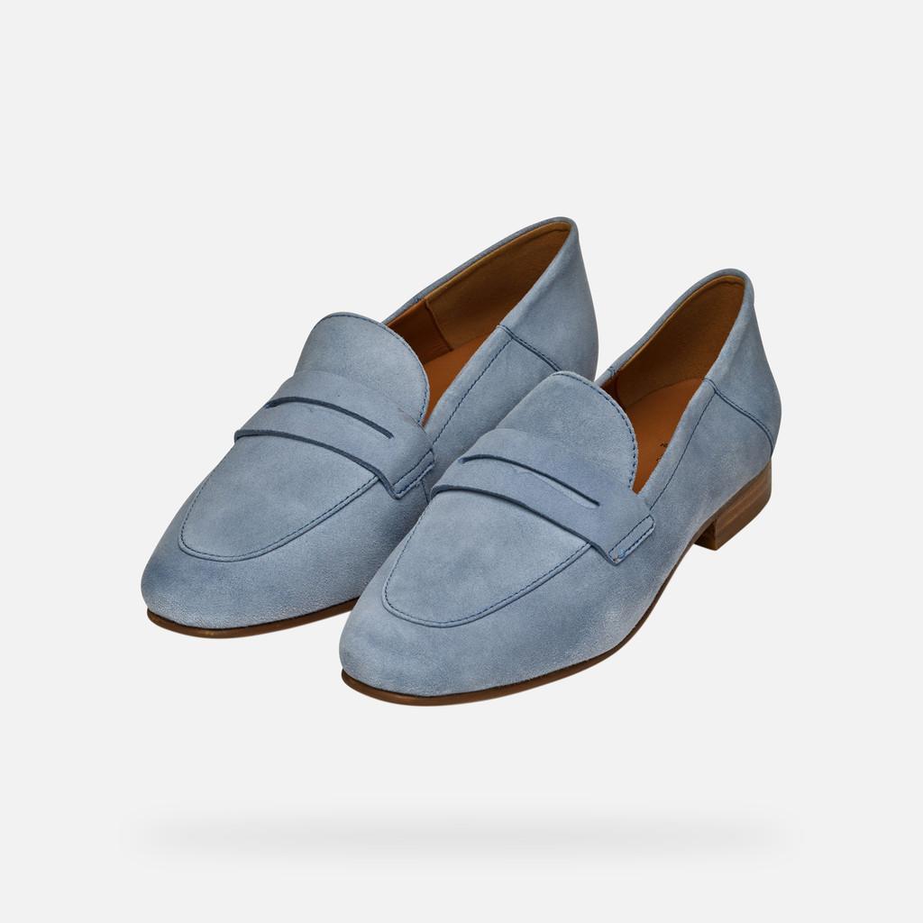 Lightweight breathable loafer for women designed with city engagements in mind. It boasts a suede upper rendered in a chic light-blue shade. Refined and fairly formal, Mantinea has a sleek silhouette with a modern square toe.