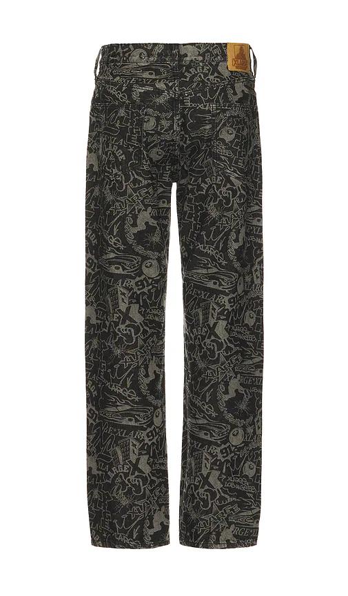 XLARGE Discharge Print Denim Pants in Black. Size 30, 34, 36. 100% cotton. Made in China. Hand wash. Zip fly and button closure. 5-pocket design. Printed rigid denim. 19 at the knee narrows to 18 at the leg opening. XLAR-MJ2. 101244031001.