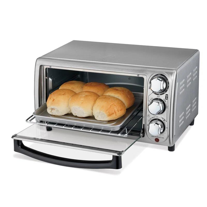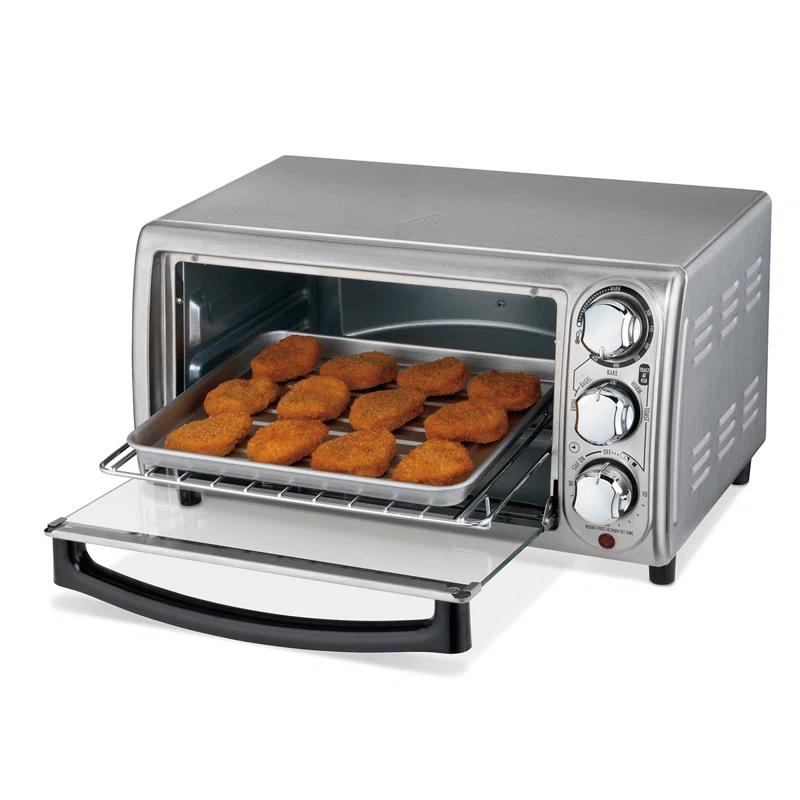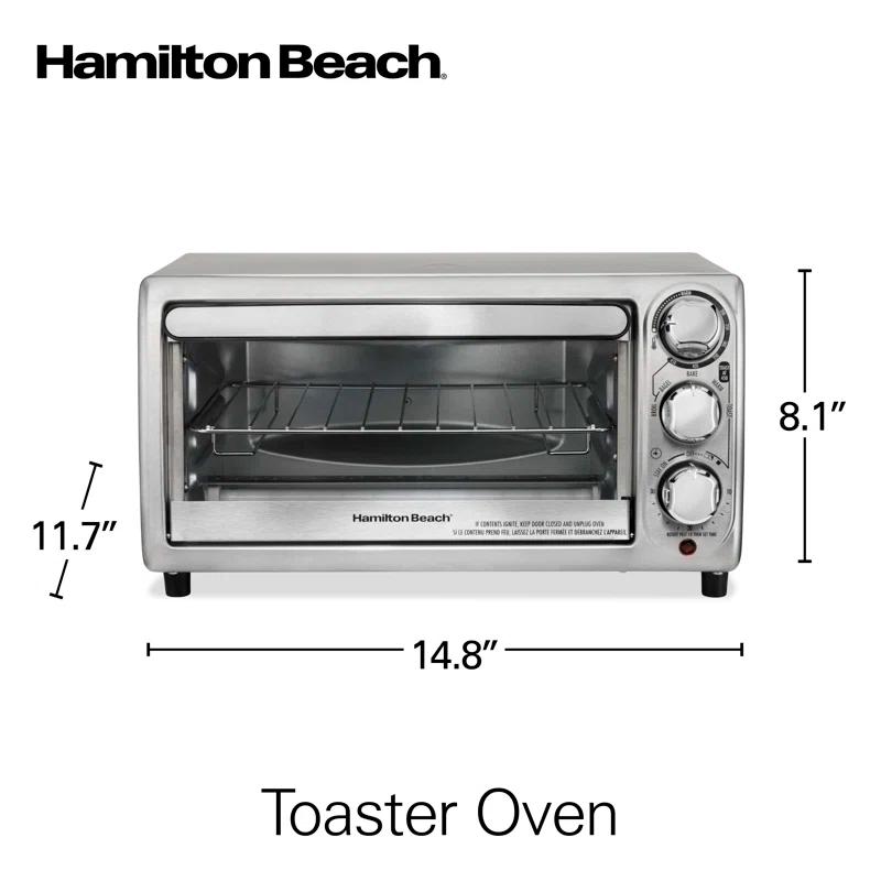 Conveniently toast 4 slices of bread to save time in the kitchen with the Hamilton Beach® Toaster Oven. It gives you the versatility to cook 5 ways — bake, broil, toast, bagel function, and keep warm, yet it won't take up a lot of space on your kitchen countertop. It's perfect for everyday jobs, like making toast, cooking frozen meals, and reheating leftovers but can do much more like bake a small batch of brownies or broil chicken breasts. The toaster oven has simple manual controls that are straightforward and easy to use. It's great for seniors or anyone who wants a toaster oven that efficiently does the job without being complicated. The toaster oven has a 30-minute timer with a Stay On function, a ready bell that rings when the cooking cycle is complete, and auto-shutoff. It has two rack positions and includes a baking pan and oven rack. The slide-out crumb tray makes cleanup easy. With temperature options ranging from 200-450° F, you'll easily cook a variety of different foods in this toaster oven. The bagel function perfectly toasts bagels so they're toasted on the cut side and warm and soft on the round side. Hamilton Beach