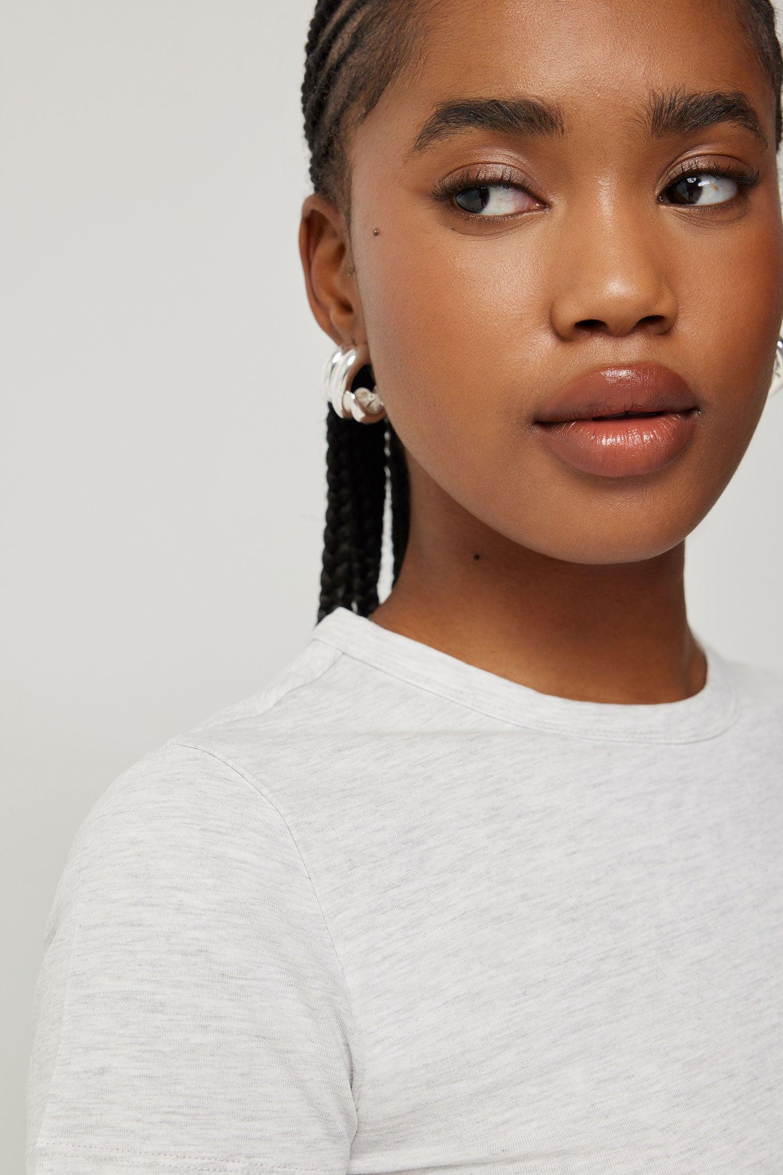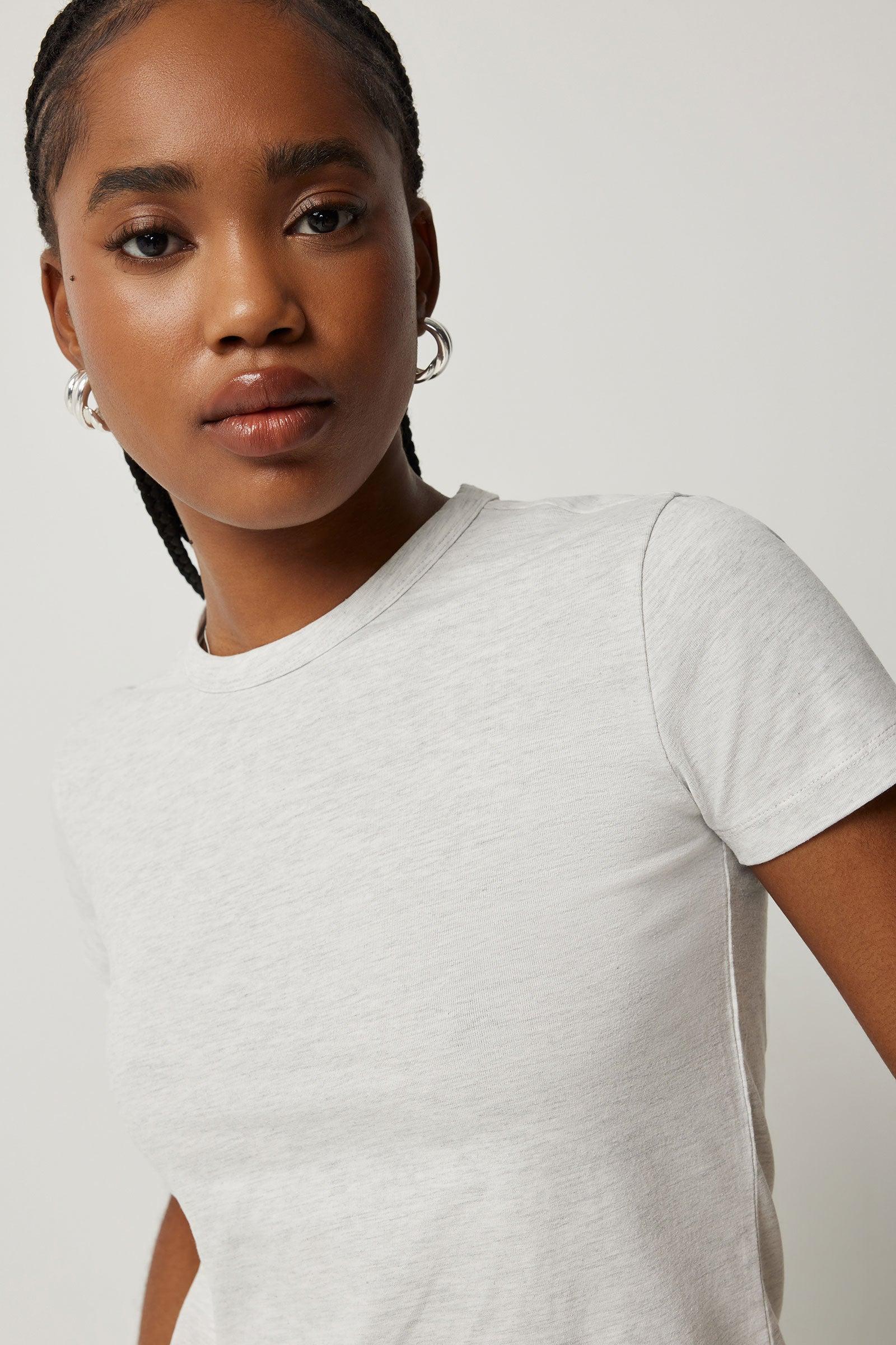 Exclusive piece from our Basic collection. Eco-conscious short t-shirt in organic cotton. Crew neck Short sleeves Relaxed silhouette 95% organic cotton, 5% elastane Model is wearing size SOrganic cotton comes from non-GMO plants, and is grown without the use of synthetic agricultural chemicals. | Ardene Effortless Everyday T-Shirt in Light Grey | Size Large | Cotton/Elastane | Eco-Conscious