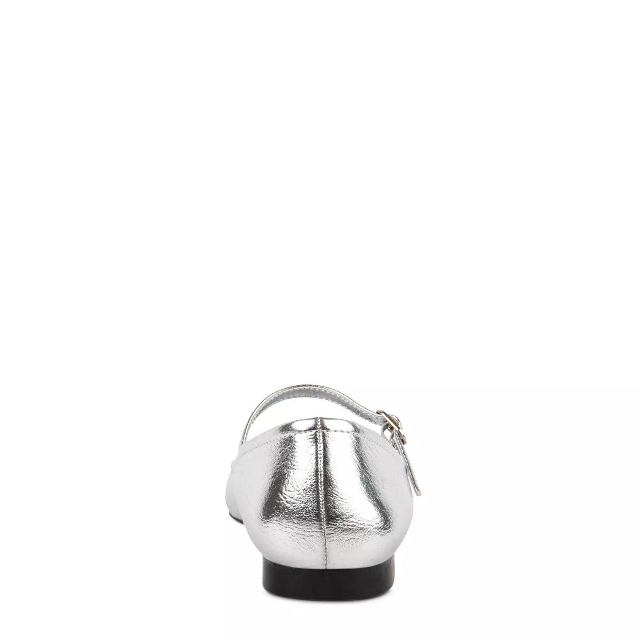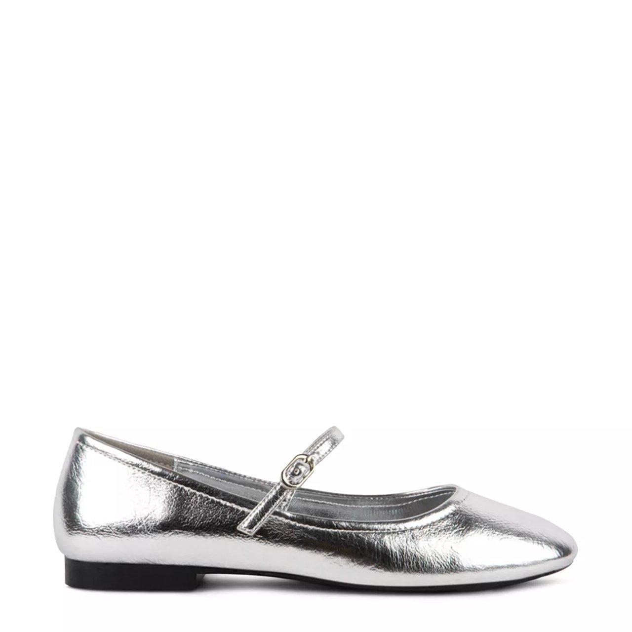 Complement your classy wear with these beautiful women's Steve Madden Danseur silver casual flats. Made of crinkled patent synthetic upper with an eye-catching metallic finish, these ballet flats have a round top and an adjustable Mary Jane strap with buckle closure for classic styling and a secure fit. Features include soft textile lining, a gently padded footbed for comfort, and a durable synthetic outsole. This style is exclusive to Designer Brands Canada.