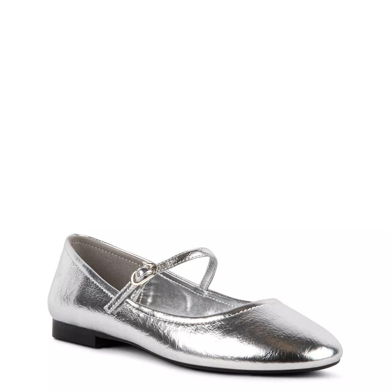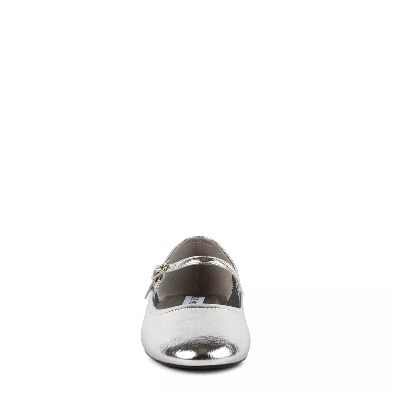 Complement your classy wear with these beautiful women's Steve Madden Danseur silver casual flats. Made of crinkled patent synthetic upper with an eye-catching metallic finish, these ballet flats have a round top and an adjustable Mary Jane strap with buckle closure for classic styling and a secure fit. Features include soft textile lining, a gently padded footbed for comfort, and a durable synthetic outsole. This style is exclusive to Designer Brands Canada. | Steve Madden Women's Danseur Mary Jane Flat in Silver Size 38 Medium