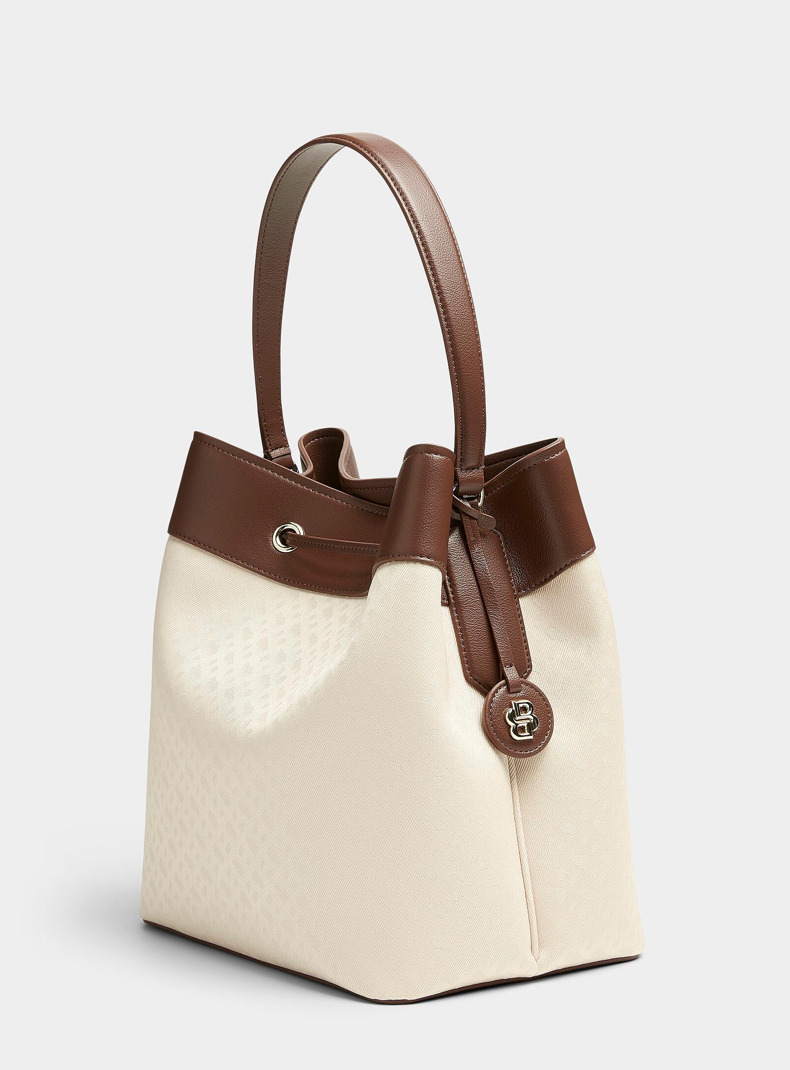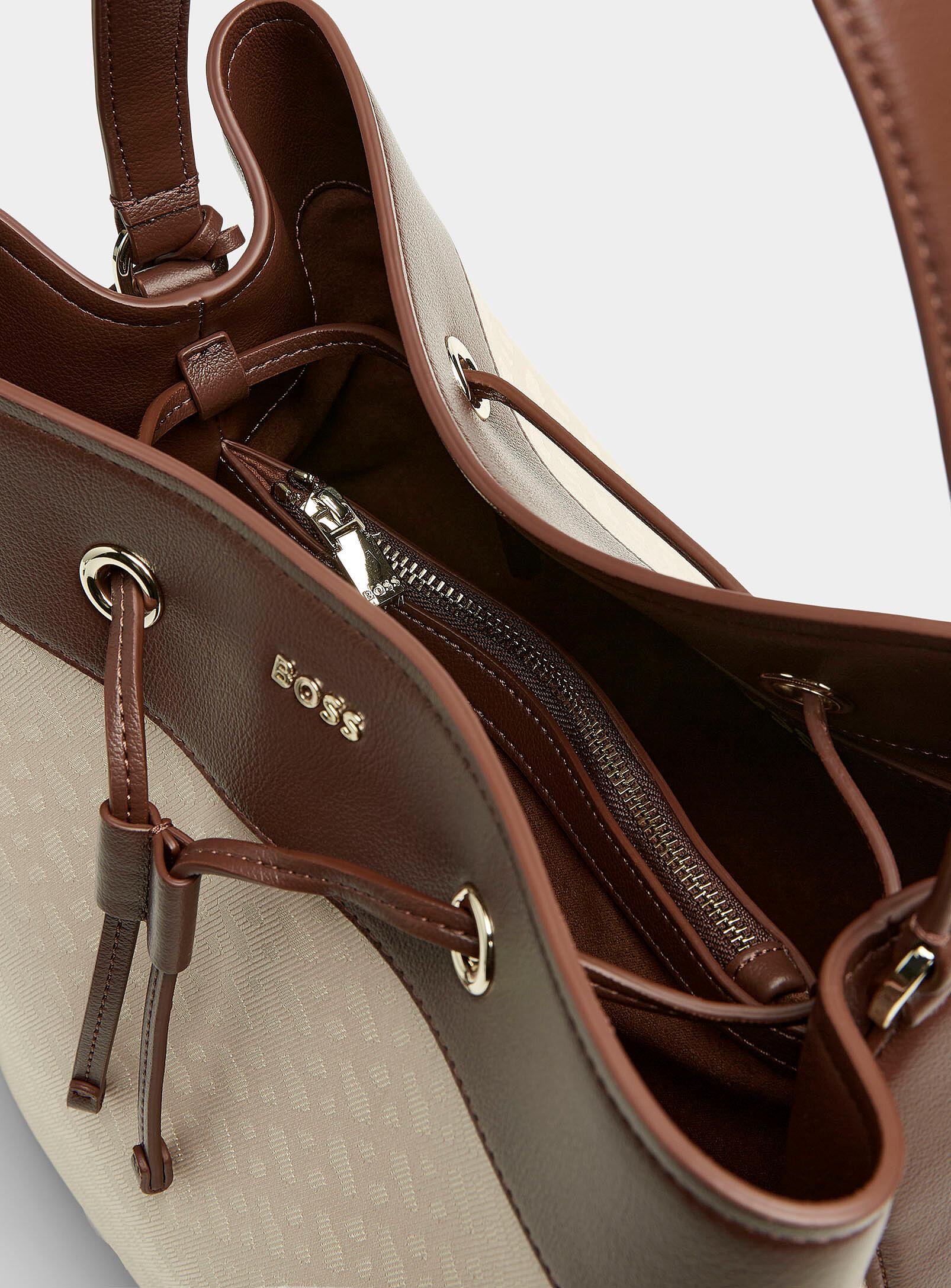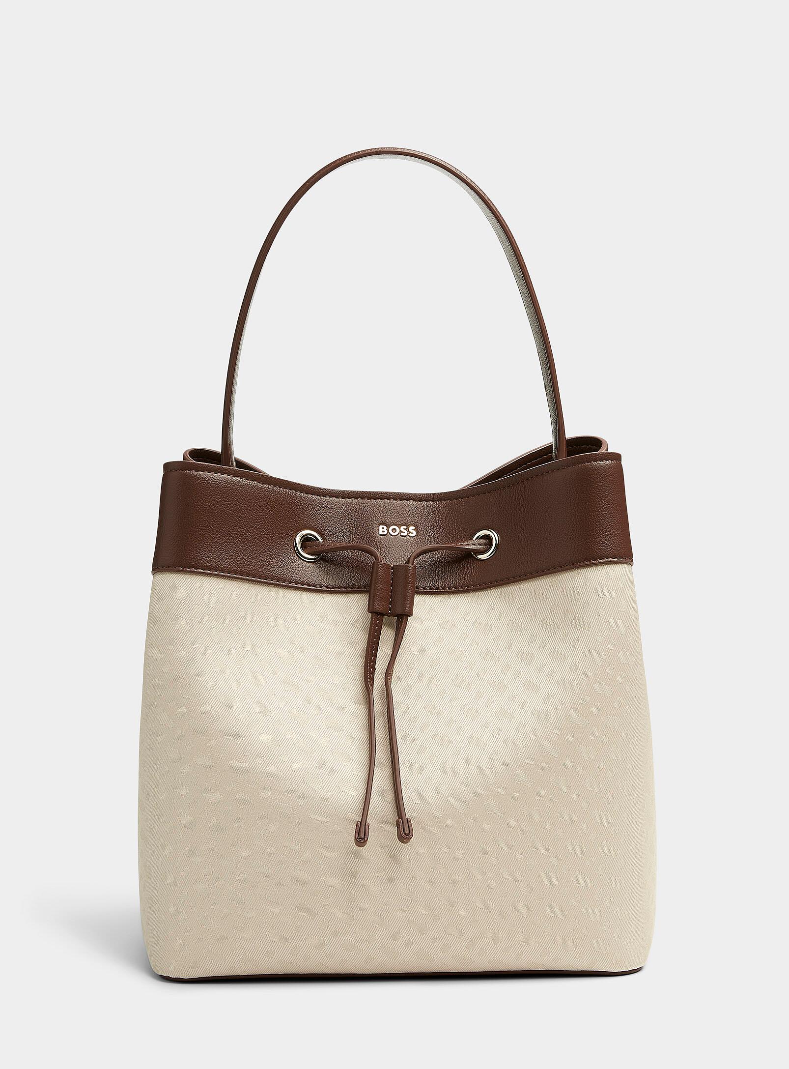 BOSS - Liriel satiny bucket bag BOSS BOSS by HUGO BOSS at Simons Satiny polyester fabric, faux-leather accents Polyester lining Drawstring closure Grab handle Two main compartments separated by a central zip pocket Zip pocket and slit pocket inside Studs on the bottom of the bag Height: 11" (28 cm) Length: 10.25" (26 cm) Width: 6.75" (17 cm)