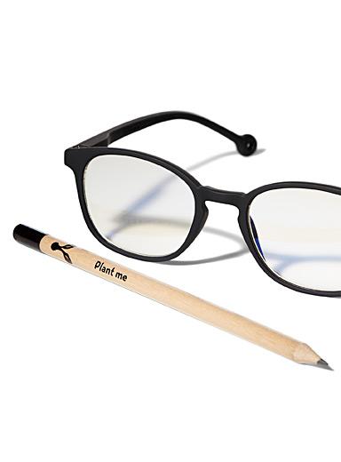 Ultra light frame made of high-quality 100% recycled plastic. Strong polycarbonate lenses. Rigid case made of recycled plastic, soft case, small cleaning cloth and designer pen included. The eco-friendly pencil contains seeds. Plant it when you are done using it and a tree will emerge. The suggested sizes correspond to the strength of the lenses.