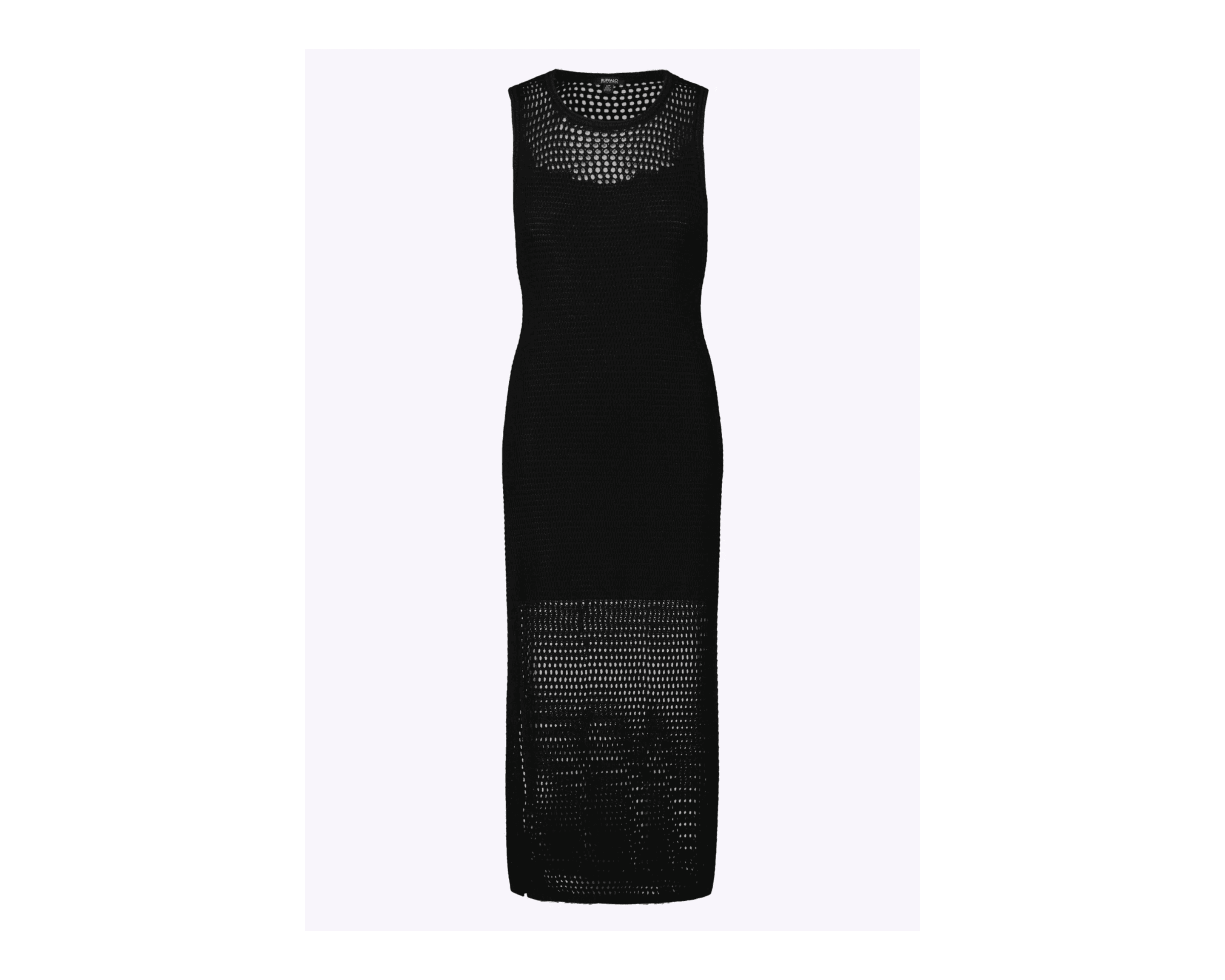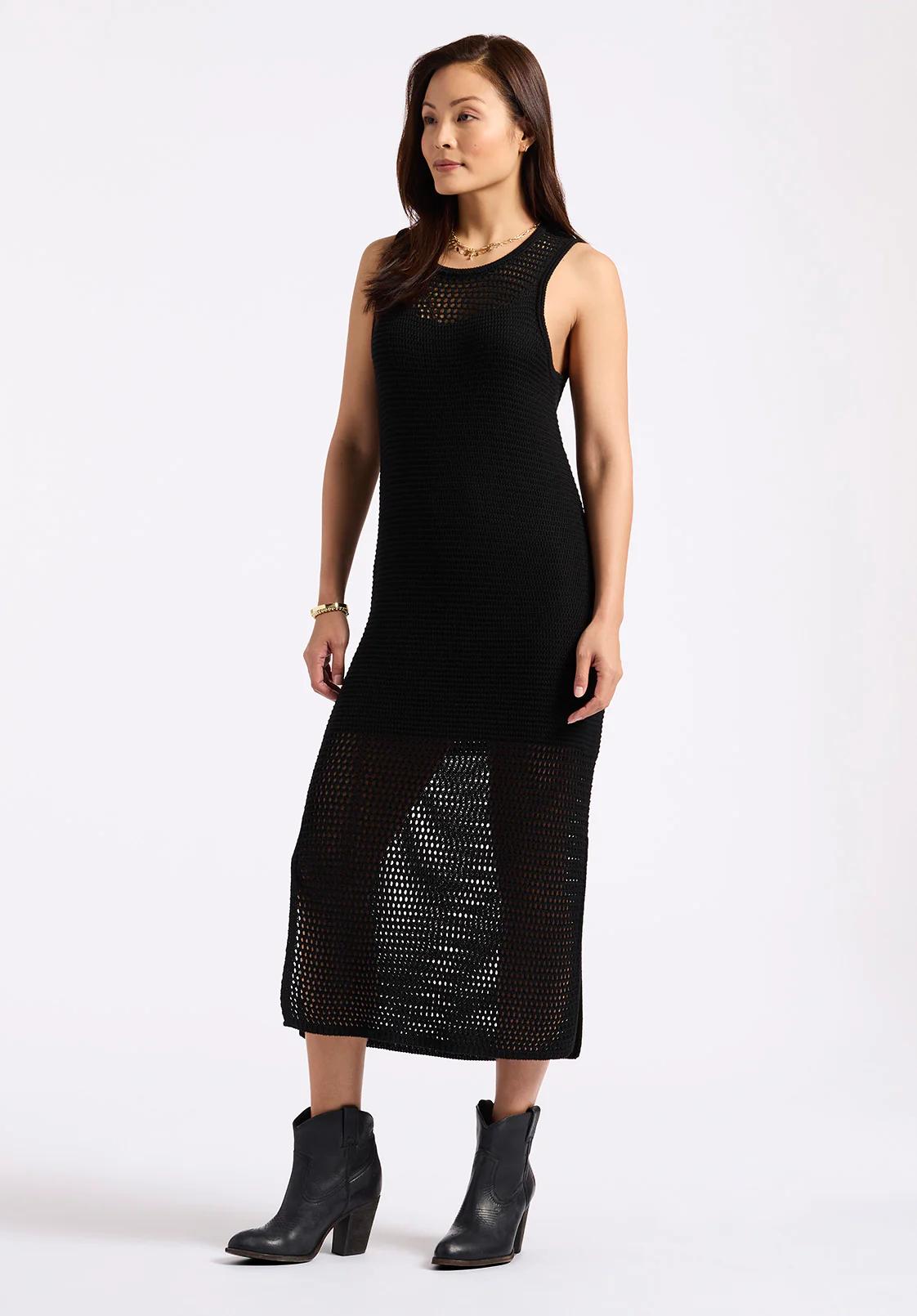 Effortlessly chic and versatile, this sleeveless midi dress Bronwen features an open-knit design that exudes modern elegance. Perfect for layering, the dress is crafted with a textured knit pattern that offers both breathability and style. A side slit adds a hint of allure while enhancing ease of movement, making it ideal for day-to-night wear. Pair it with your favorite boots or sandals for a statement-making look that transitions seamlessly across seasons.