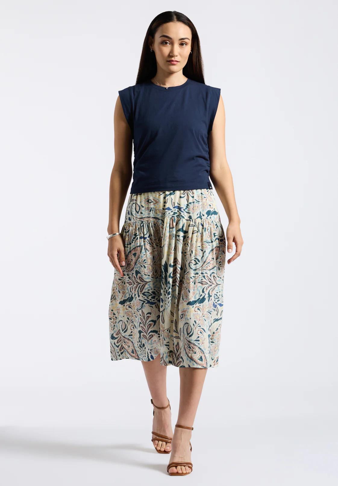 Elevate your wardrobe with this beautifully designed midi skirt featuring an enchanting all-over paisley print. Crafted with lightweight and flowy fabric, this skirt offers exceptional comfort and style. The tiered structure provides a flattering silhouette, while the elastic waistband ensures a perfect fit for all-day wear. Pair it effortlessly with a tucked-in top and heels for a chic, polished look.