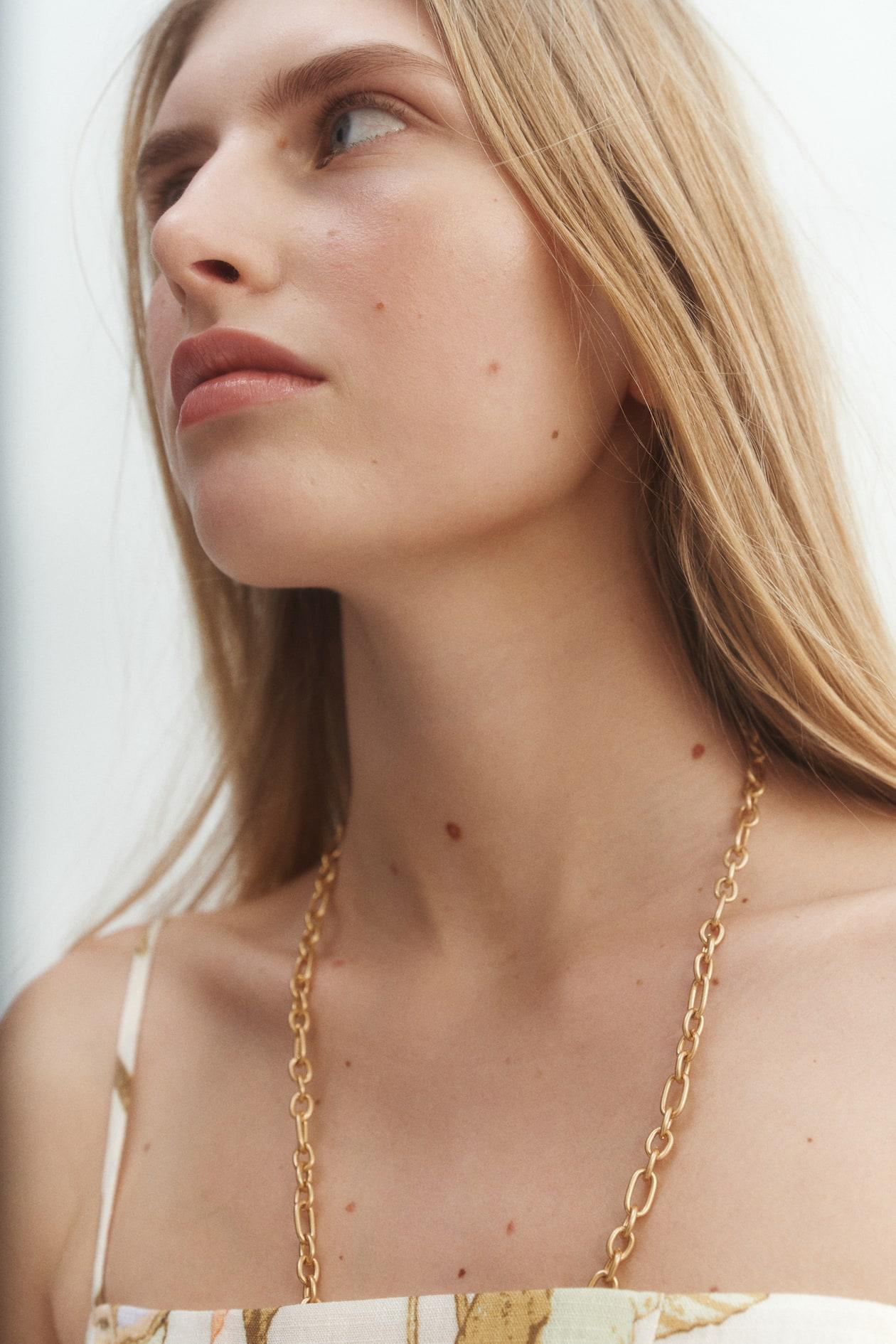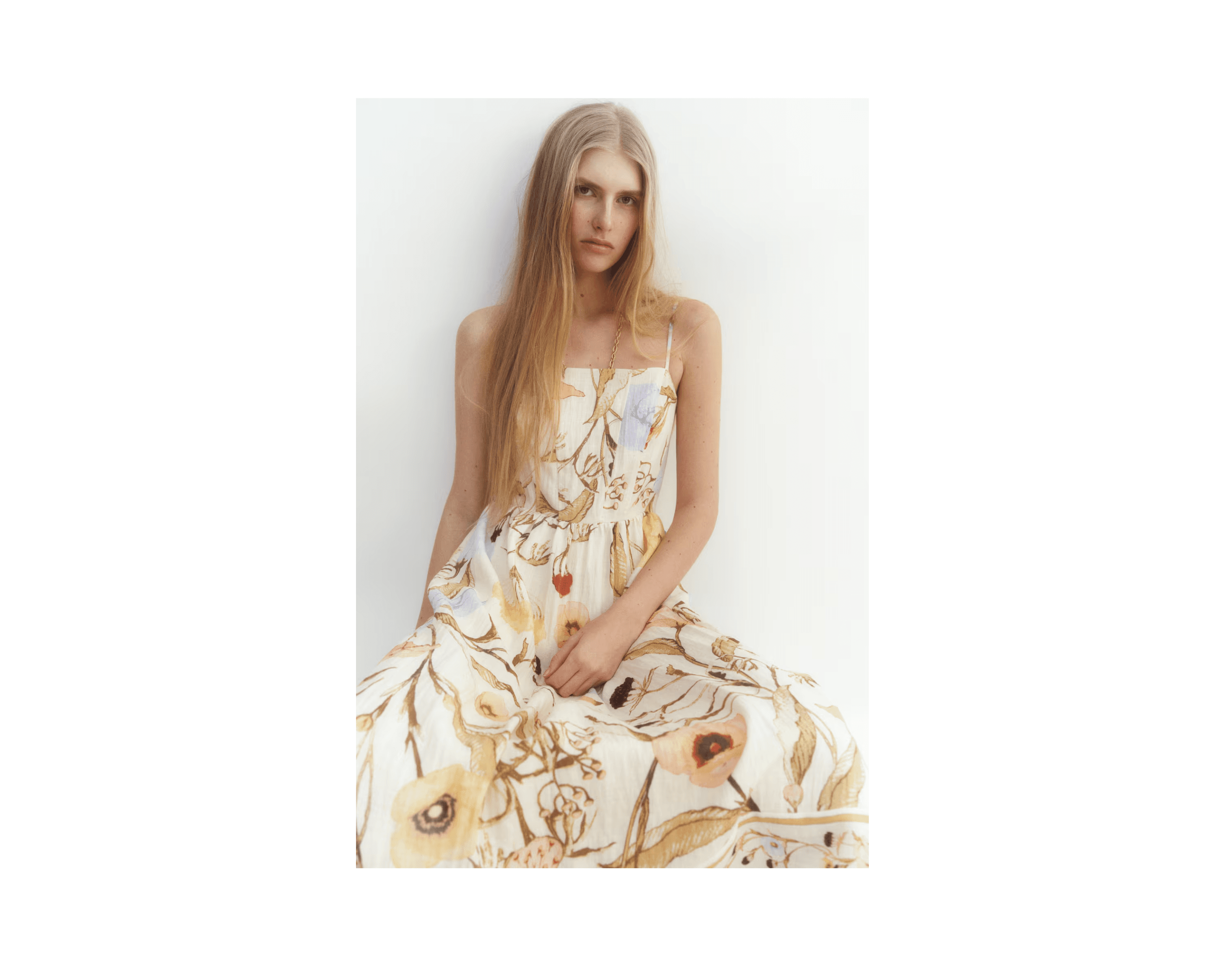 Calf-length dress in airy, woven fabric with narrow, adjustable shoulder straps. Fitted bodice with a square neckline, shaping seams at front, and wide smocking at back. Gathered seam at waist and a flared skirt. Lining in cotton voile.