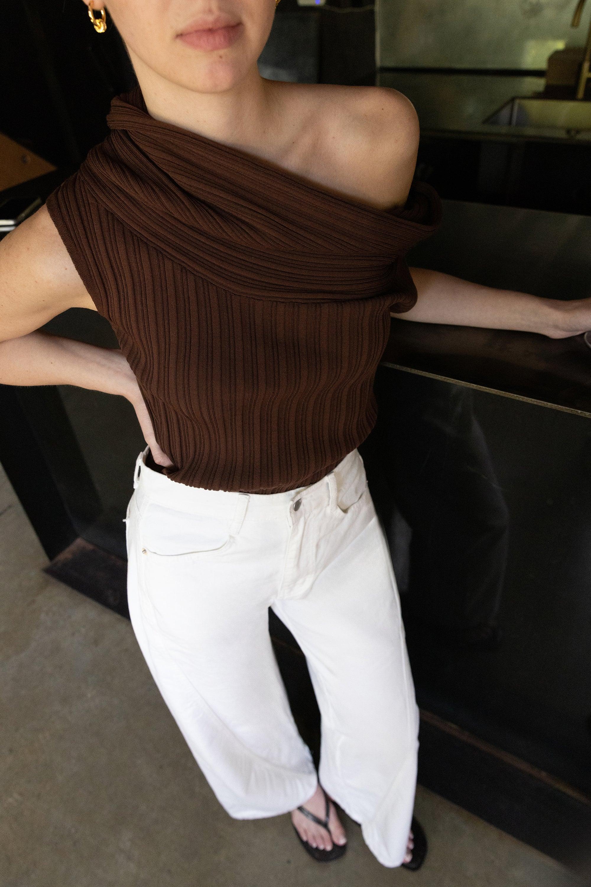 The perfect summer knit to add to your rotation. This short sleeve off the shoulder sweater has a varied ribbed-knit and is made for a relaxed fit. Wear yours from day to night with straight leg trousers and sandals.