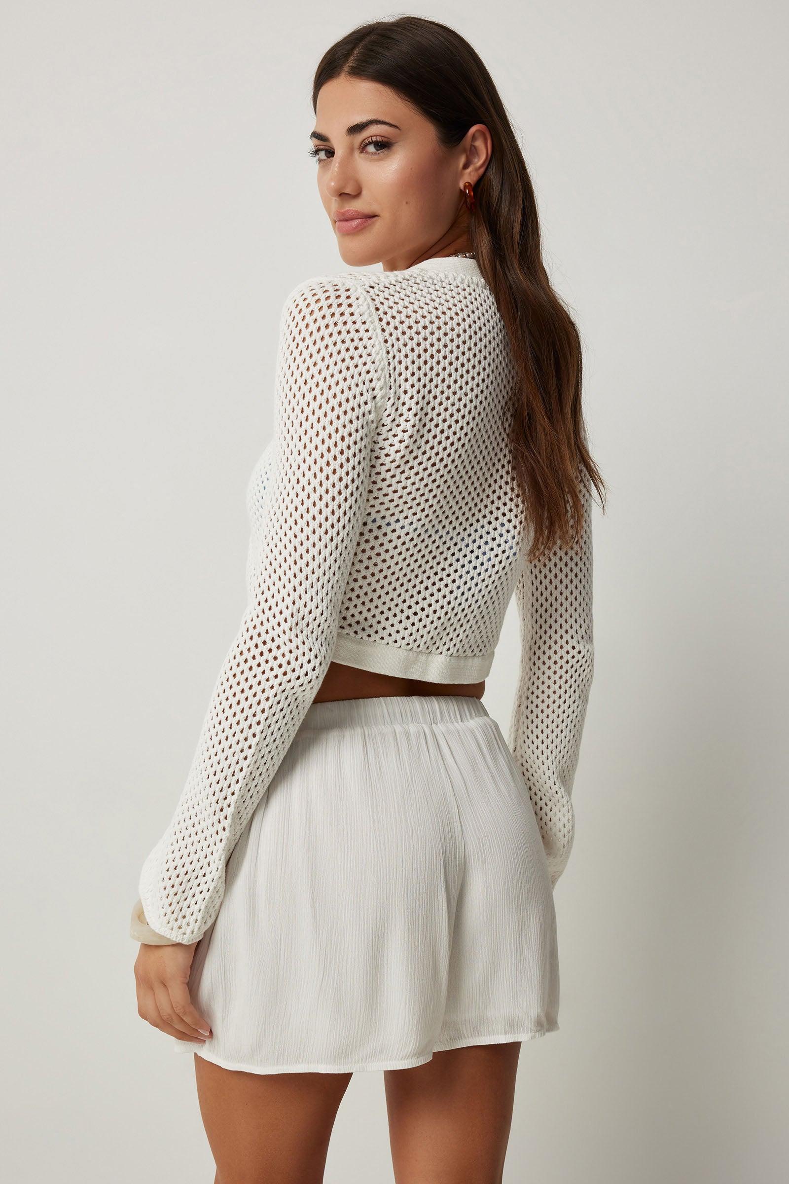 Crocheted cropped cardigan. Wear it as a swim cover-up! Unlined Long sleeves Self-tie closure 100% cotton Model is wearing size XS/SFor size XS/S, select SFor size L/XL, select L | Ardene Tie Front Crochet Cardigan in White | Size Large | 100% Cotton