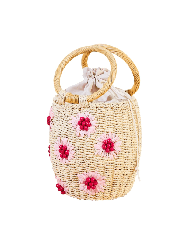 NIBD Flower Pearls Rattan Tote Bag Summer Beach Drawstring Straw Bucket Bag Diamonds Woven Handbag