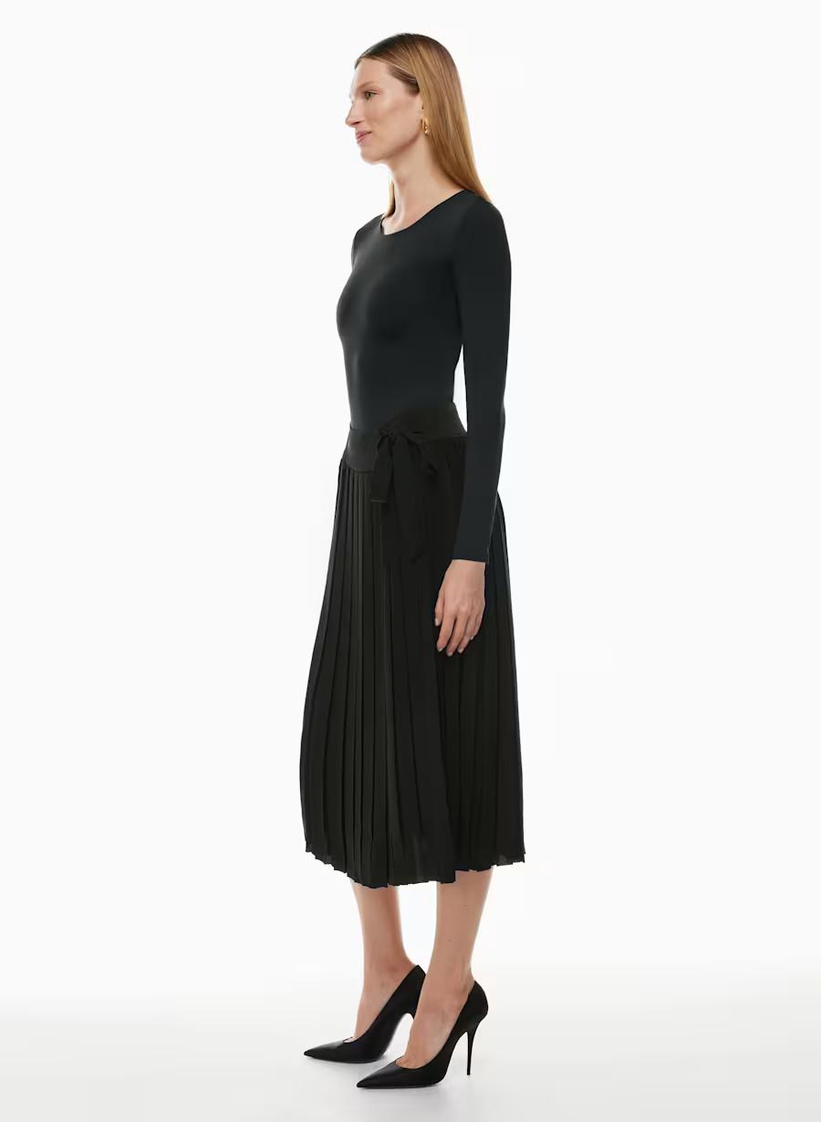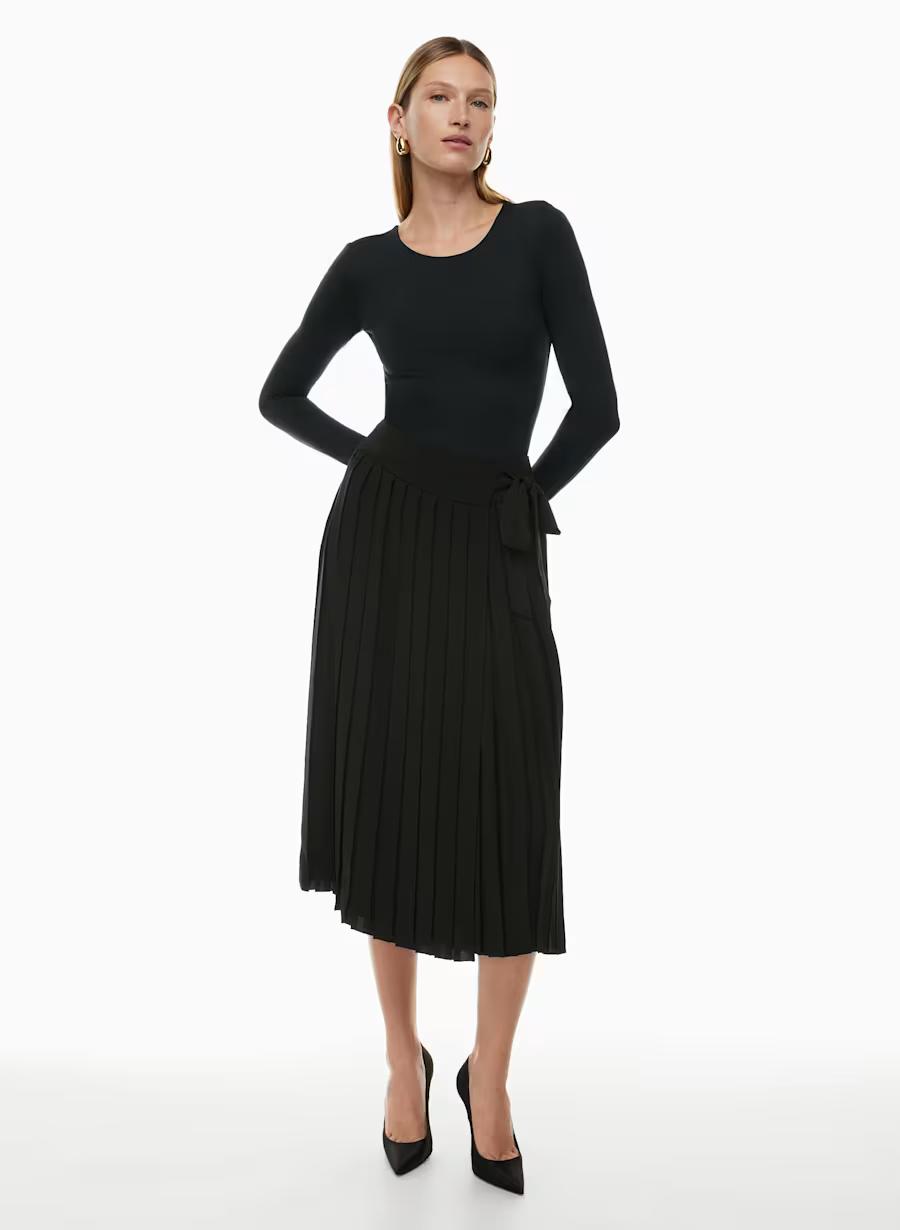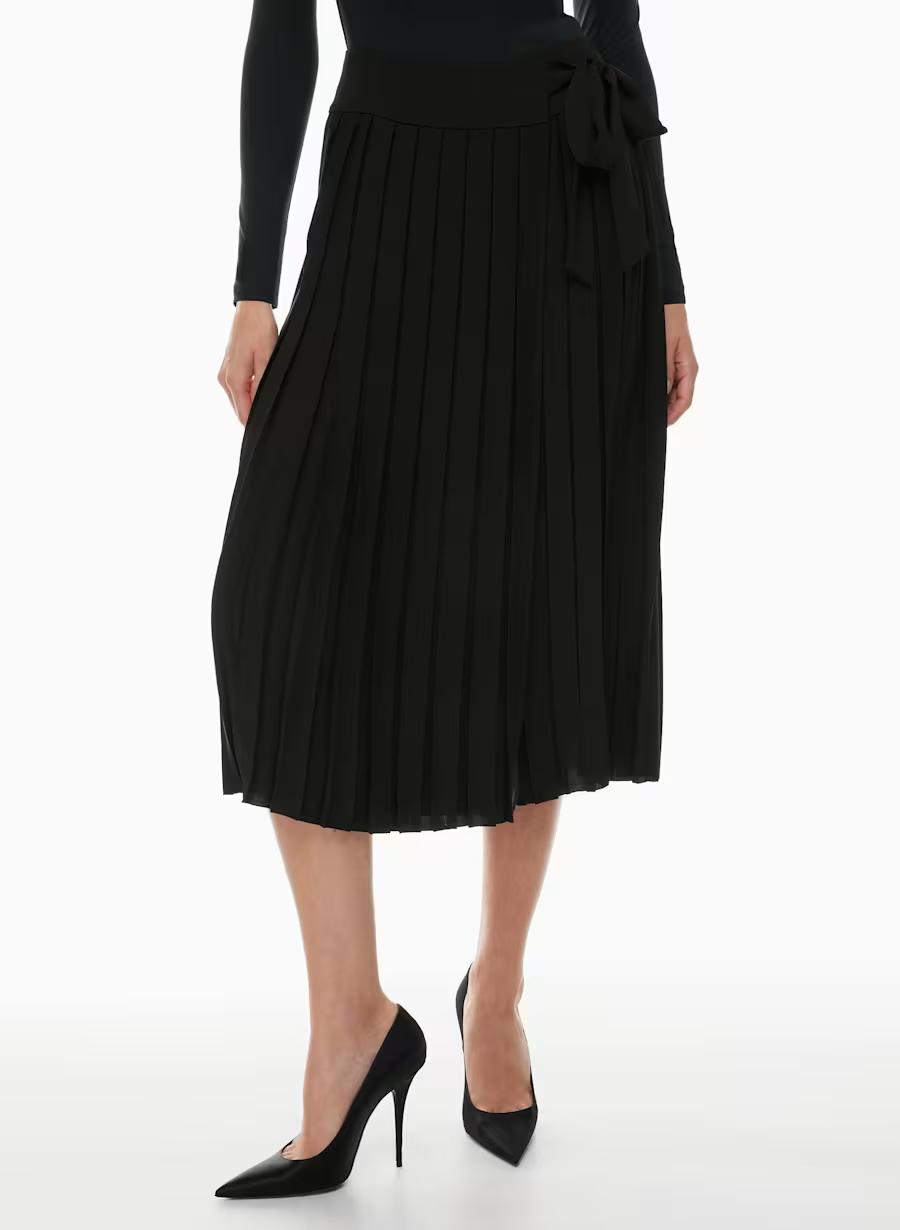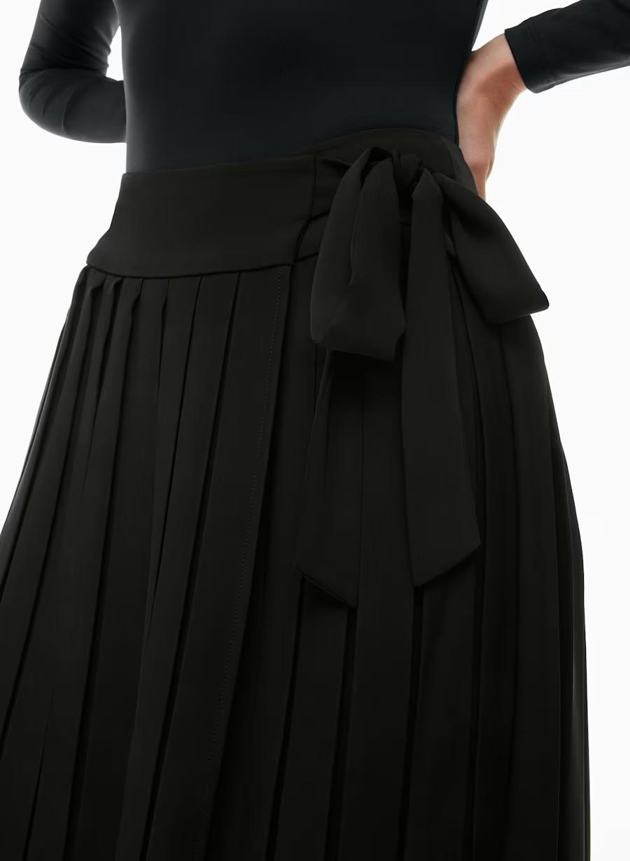 This is a pleated midi wrap skirt with a high rise and a self-tie detail at the waistband. It’s made with Studio Drape — drapey matte satin with a smooth look and lightweight feel. This fabric is made with recycled materials.