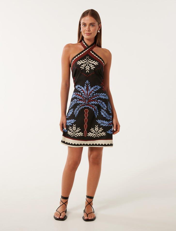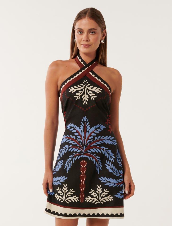 A vibrant mini dress for sunny daytime outings Highest point to hem length: 144.3cm (Size 8) Regular fit Premium linen blend fabrication Halter arrow neckline with button-up back Sleeveless design Low-cut back Shirred back panels A-line mini skirt Back zip fastening Lined