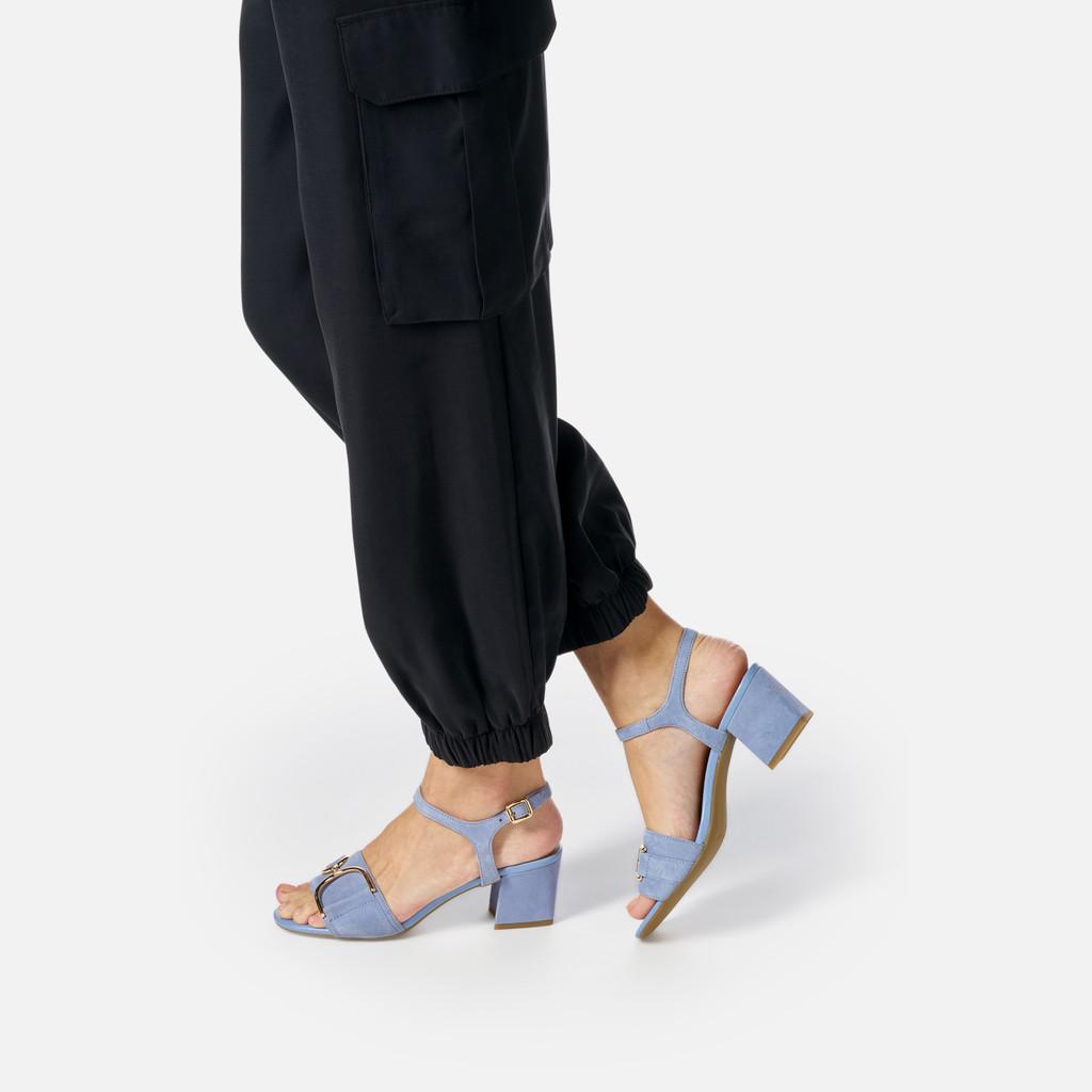 Attractive feminine-looking sandal for women with an understated pristine aesthetic completed with a chic metal detail. This classic version has been made of soft suede in a subtle and chic light-blue palette and not only has a lightweight breathable design, but also emanates timeless allure. New Eraklia 50 rests on a comfortable block heel and will lend itself to business attire and elegant outfits alike, making it the perfect partner for chic urbanites.