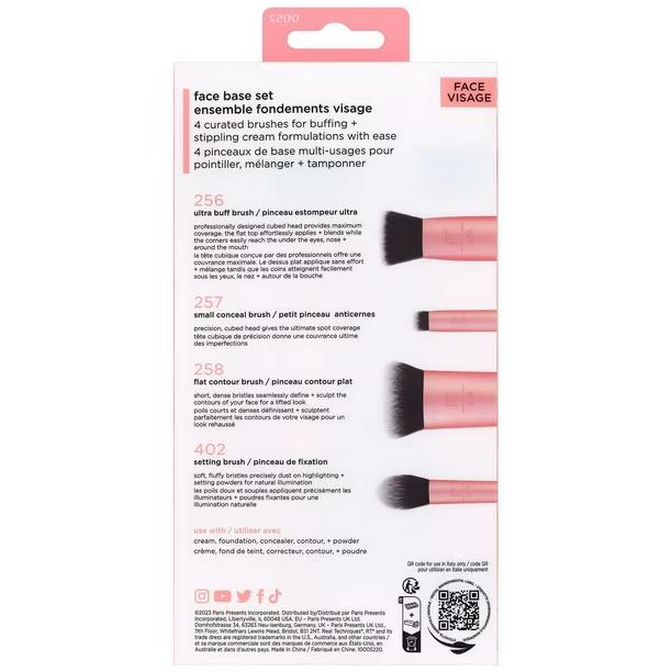 The Real Techniques Face Base Set includes 4 curated, multiuse makeup brushes to help you expertly stipple, blend, and buff on your base with ease. Real Techniques Face Base Set helps you create a seamless base that will last: Includes: (1) RT 256 Ultra Buff Brush, (1) RT 257 Small Conceal Brush, (1) RT 258 Flat Contour Brush, (1) RT 402 Setting Brush