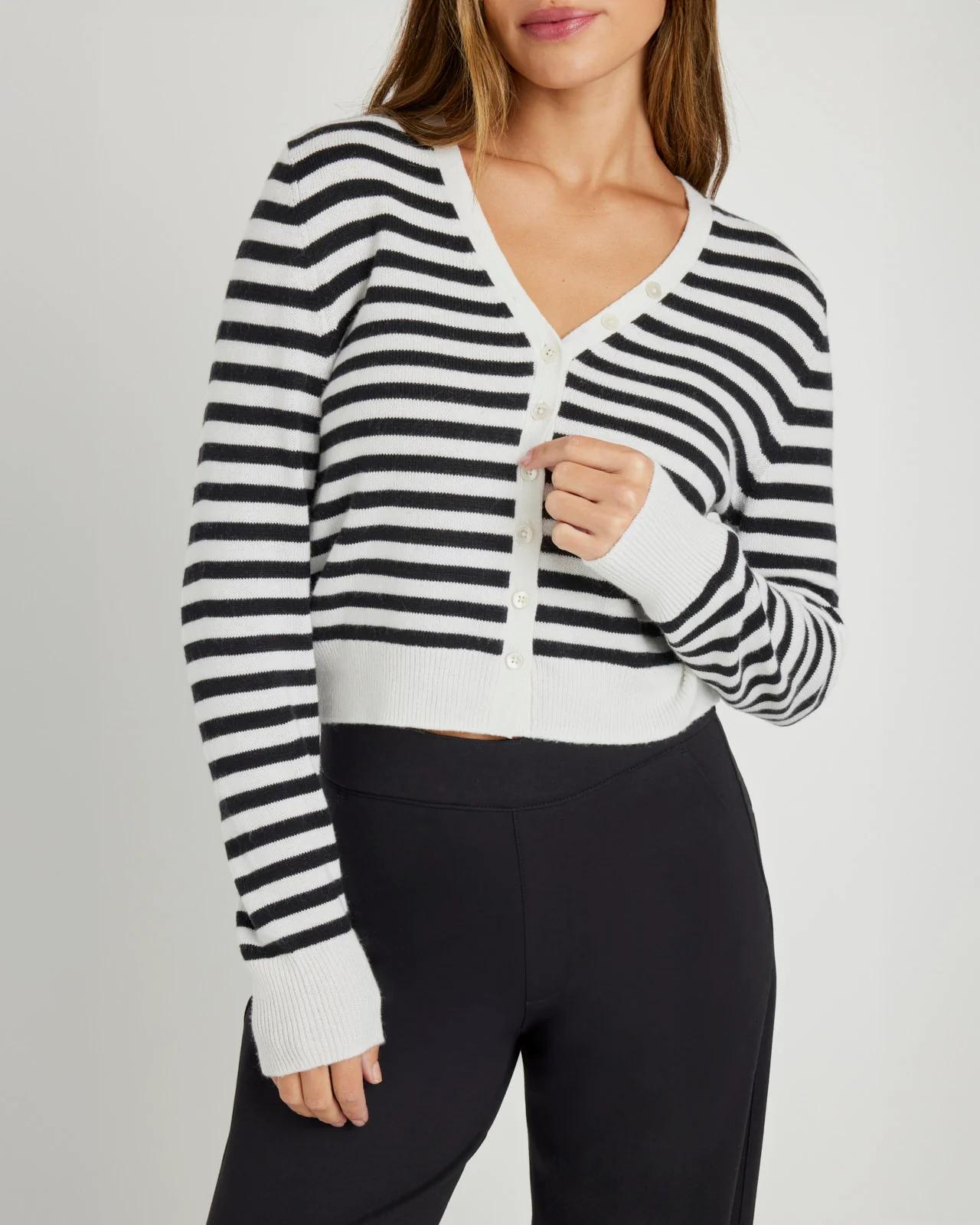 Elevate your sweater game with the Santina Stripe Cardigan-a chic blend of comfort and style. This refined button down cardigan, crafted from a cotton blend knit, marries a bold stripe design with a contemporary, slightly cropped silhouette. Pair it with high-waisted pants for a modern, timeless look. Cotton blend V-neck Button down Bold stripe design Slightly cropped