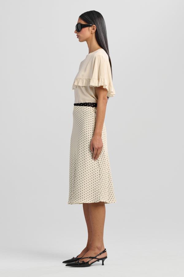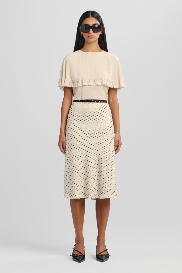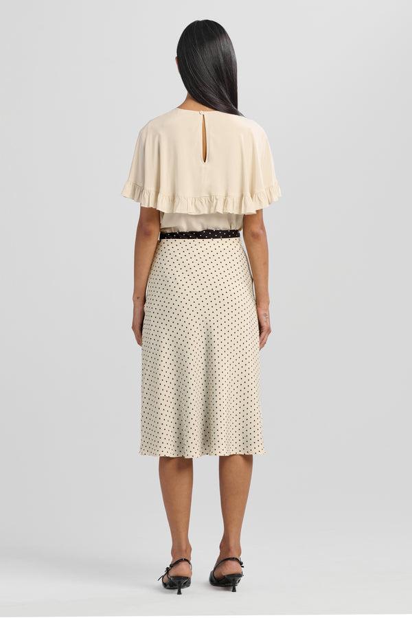 Defined by its layered cape and delicate gathered ruffles, this piece offers quiet drama and feminine movement. A refined option for day or evening, with a subtle back keyhole for added intrigue. Available in Black and Chalk.