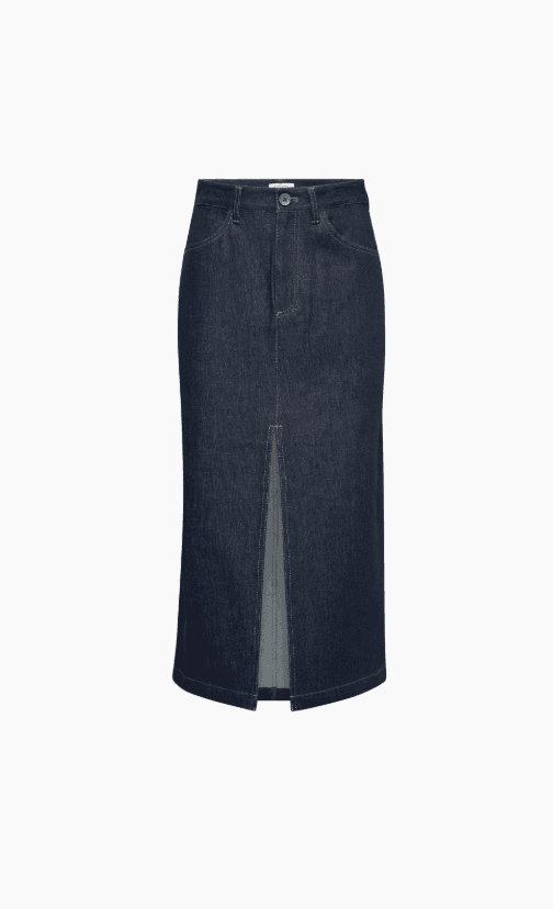 This is a denim skirt with scoop front pockets, back patch pockets and a centre front slit. It's made with non-stretch 100% cotton denim that's soft to the touch and moulds to your body with time. This version comes in a rich blue wash.