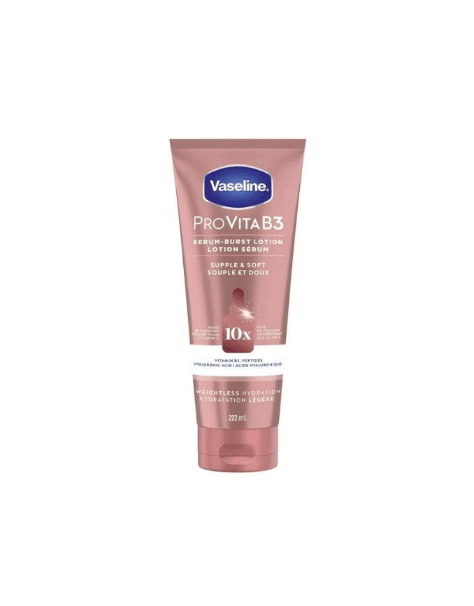 Vaseline Supple & Soft ProVitaB3 Serum Burst Lotion is an advance in beauty and skin science. Our lotion-to-serum sensory provides all-day weightless hydration that is breathable and never-greasy. Vaseline Supple & Soft Pro VitaB3 Serum Burst Lotion is enriched with Vitamin B3 (Niacinamide) Hyaluronic Acid, Ultra-Hydrating Lipids, and Peptides, this formulation revitalizes dull-looking skin and helps retain skin’s balanced hydration. This formula has an Antioxidant Complex that provides 10x more antioxidant power than Vitamin C giving your skin a healthy-looking, hydrated glow.
