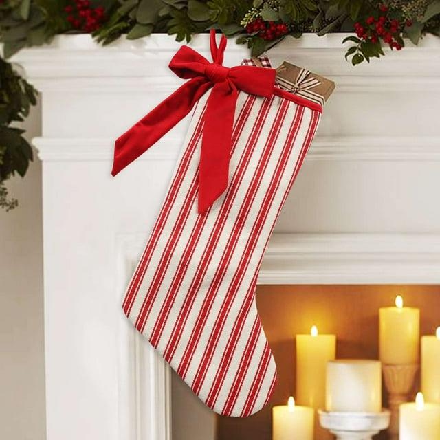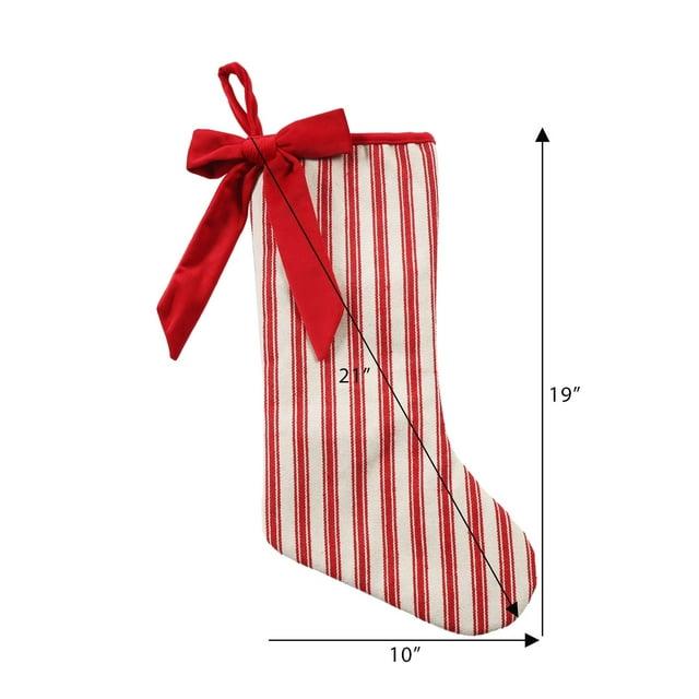 Holiday Time 21 inch Stripe Stocking,linen material base,cream and red stripe fabric, a big red bow attached to the stocking,use for Christmas decoration.Bring on the Christmas cheer with the stocking that makes a wonderful winter addition to your Holiday decoration!