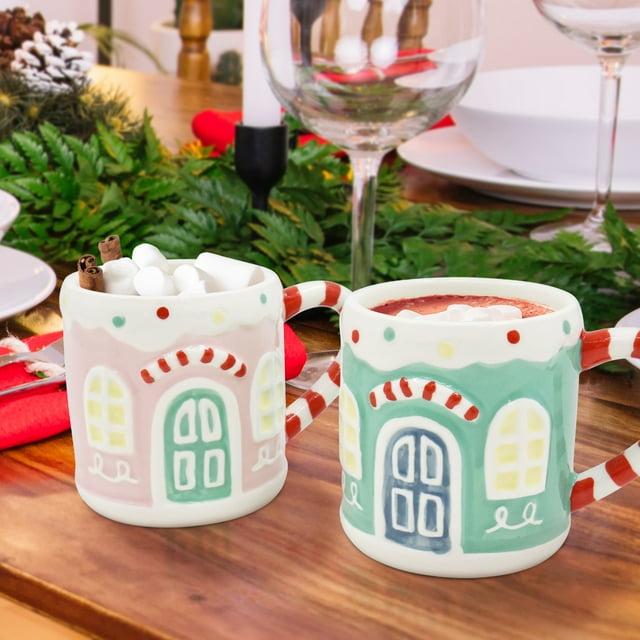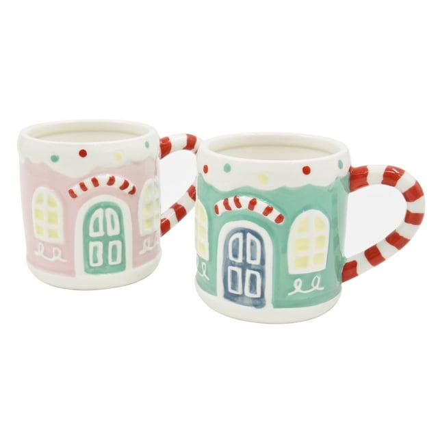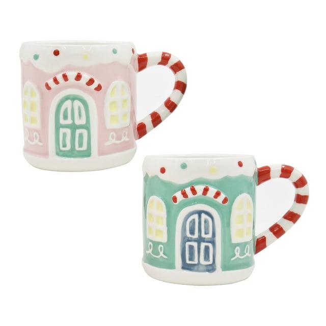 Enjoy the warm feeling of winter with the Holiday Time 2 pack Stoneware Embossed Gingerbread House Festive Stackable Mug. These stackable mugs features two sweet pastel color: pink and green, each mug has embossed and hand-painted design that adds a charming and festive touch to your home. Made from durable stoneware, these mugs are built to last. Each mug measures 5.3W x 3.8D x 3.9H inches and weighs 10.8 oz. They are safe for both dishwasher and microwave use. Perfect for tea, coffee, cocoa, or eggnog. The mugs can be stacked to save space and make a charming addition to your table, seasonal gatherings, or everyday kitchen use.