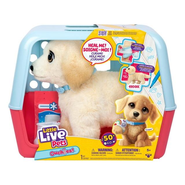 Little Live Pets Ouchies! Cooper is an adorable retriever puppy that needs your care to heal his injured leg! With over 50 sounds and reactions, Ouchies is so interactive - he walks, reacts to your touch, has glowing cheeks and more! When injured, Ouchies limps and whimpers. Transform the puppy carrier into a handy vet tray, then place the splint on puppy's leg, wet the bandages, and wrap them around the splint to make a cast like a real vet. Once dry, you can decorate the cast! Give your puppy lots of love and when he plays a happy sound, remove the cast! Watch Ouchies transform from limping to healed as he lifts his head up and walks along to his happy song! Take your healed puppy for a walk and play. Experience interactive vet play and transformation with Ouchies!