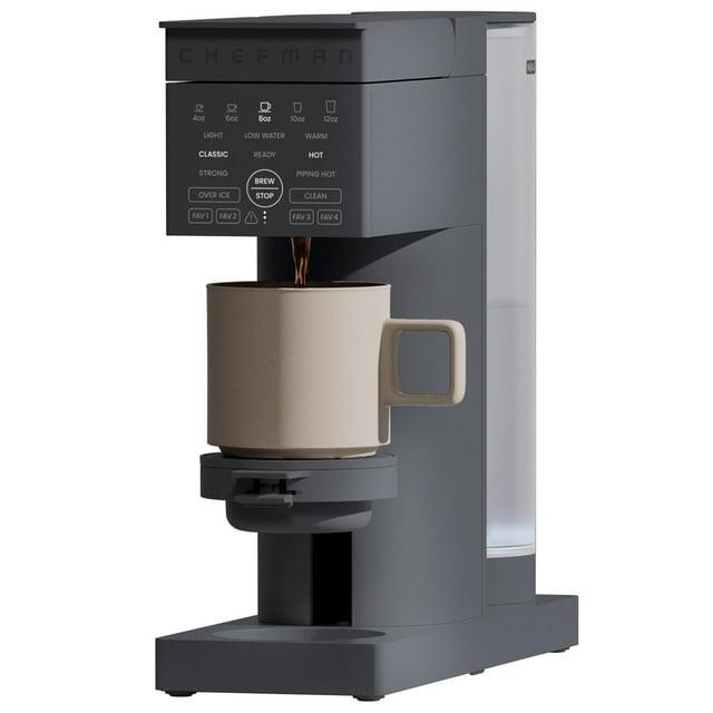 Get excited to wake up and smell the coffee with the Chefman Caffeinator, a single serve coffee machine that helps you enjoy your morning pick-me-up your way. Compatible with both coffeepods or your favorite ground coffee, you can serve up your ideal roast your way. With five size options (4, 6, 8, 10, and 12 ounces), 3 brew strength settings, and 3 temperatures, you can customize your drip coffee to your exact preference.