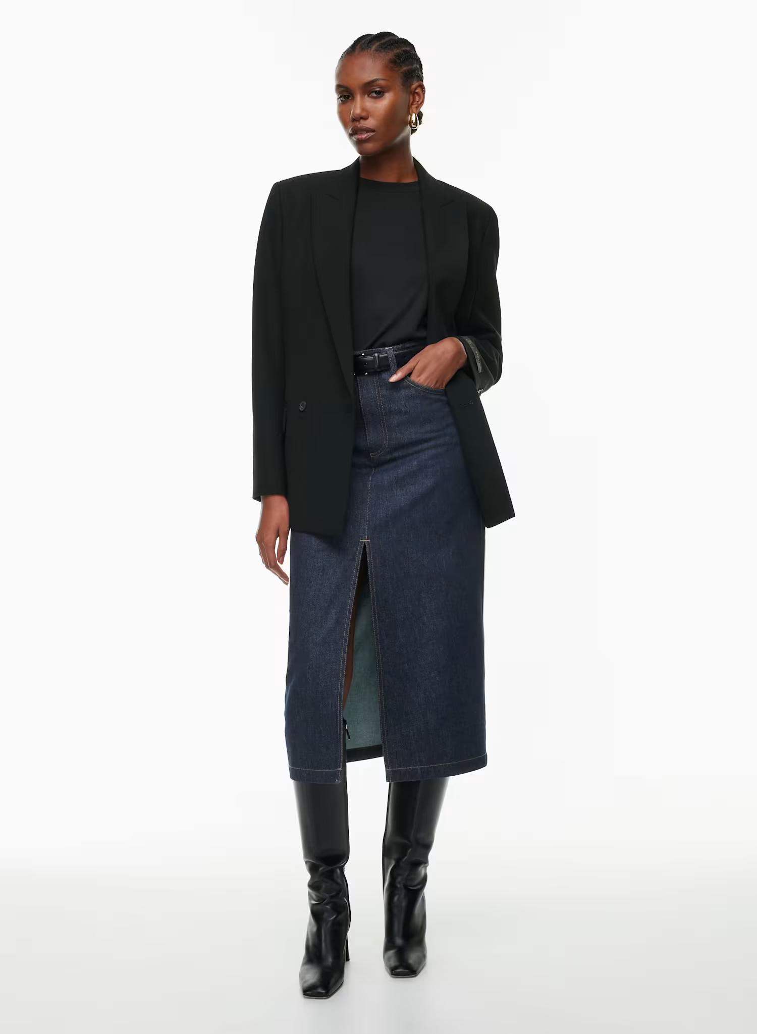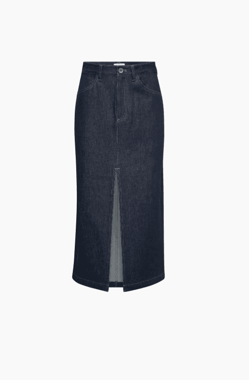 This is a denim skirt with scoop front pockets, back patch pockets and a centre front slit. It's made with non-stretch 100% cotton denim that's soft to the touch and moulds to your body with time. This version comes in a rich blue wash.