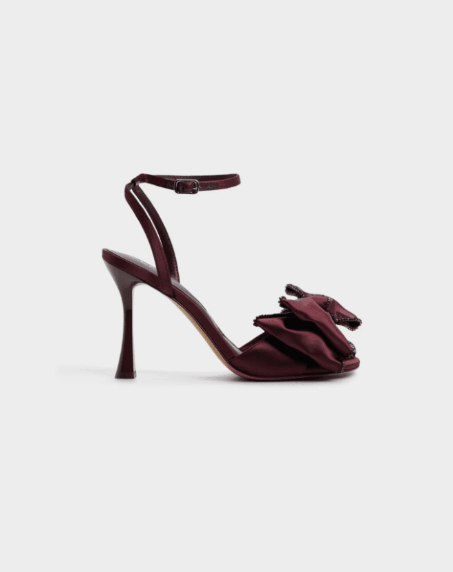 Deep burgundy satin winds into sculpted ruffles at the open toe, elevated by a sharp stiletto silhouette and cushioned by a leather-lined interior that keeps elegance steady from first click of the evening to the last sashay. Pair with silky slip dresses for cocktail parties or ground tailored jumpsuits when gallery openings call.