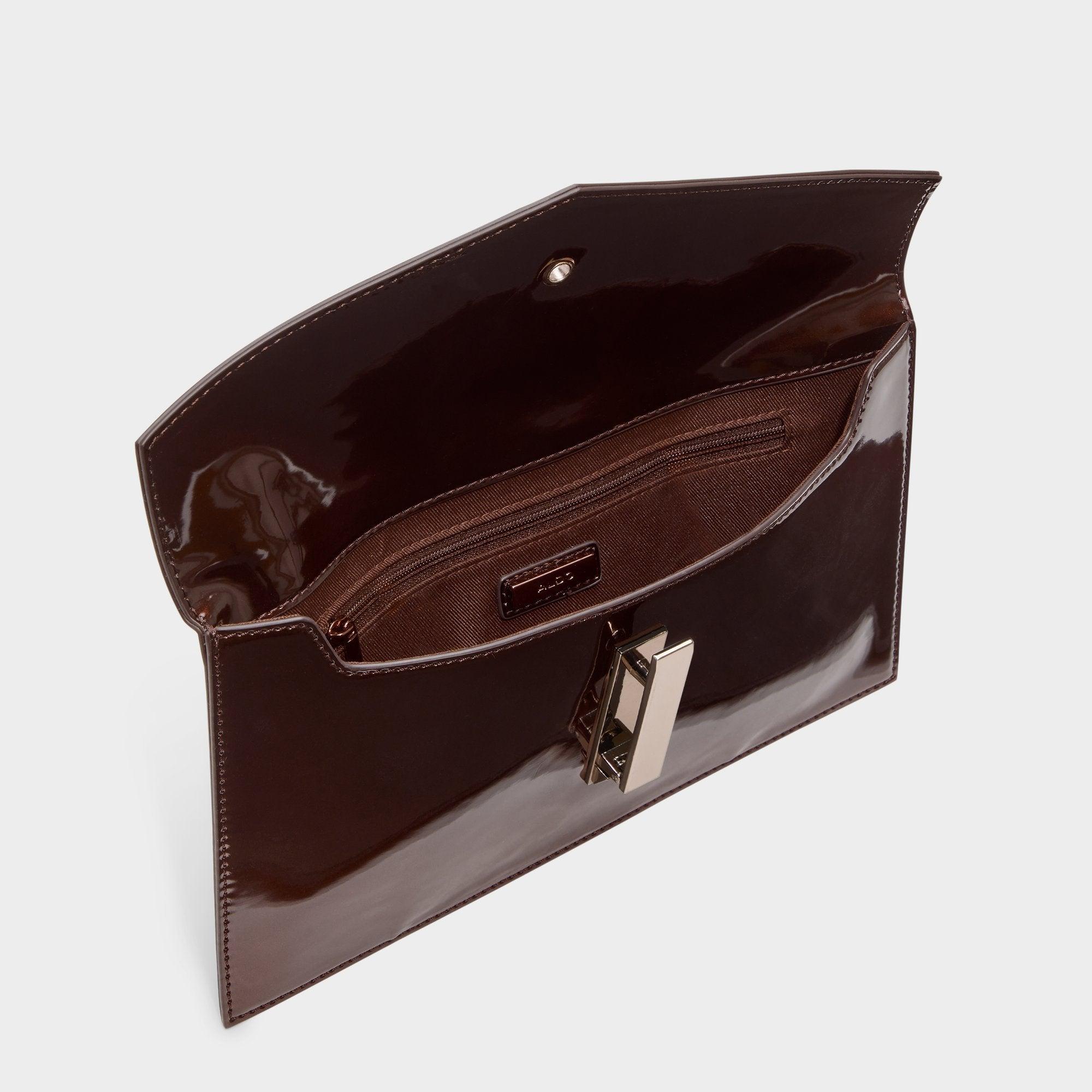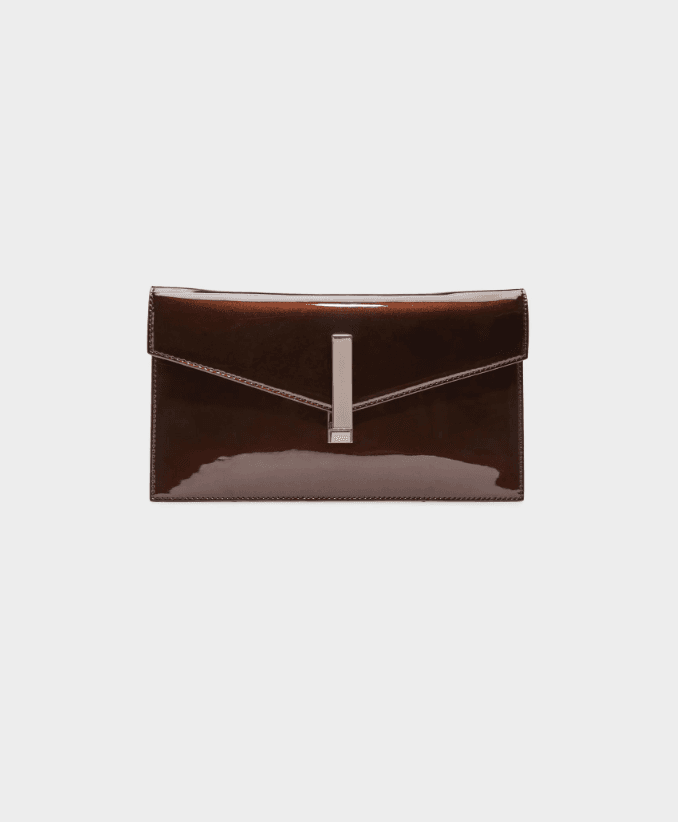Espresso patent gloss brightens a curved envelope silhouette, with a sculptural silver bar snap revealing just enough space for the essentials, and a refined, architectural profile that feels instantly polished for evenings and rooftop dinners. Carry it under a satin blazer for rooftop dinners, or sling it over a knit midi and boots for artsy gallery afternoons.