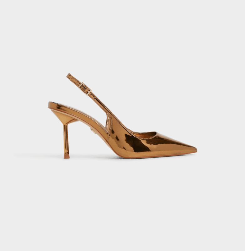 Molten metallic leather covers this razor-sharp point-toe slingback, pairing a slim stiletto with an adjustable buckle to give your stride edge as neon lights sweep every confident step through the city. Pair with sleek suiting for presentation mornings, or swap in a satin mini for nights out.