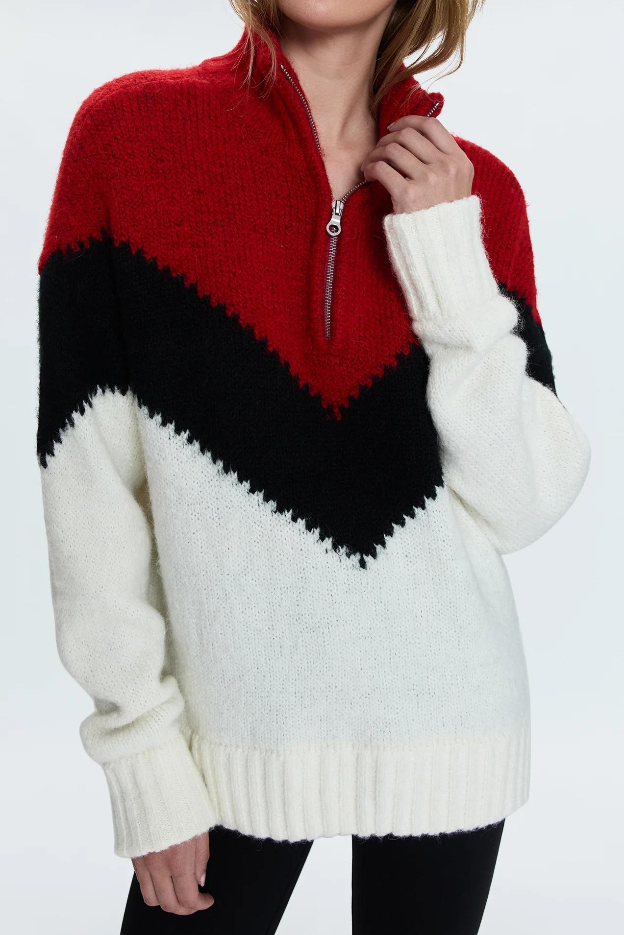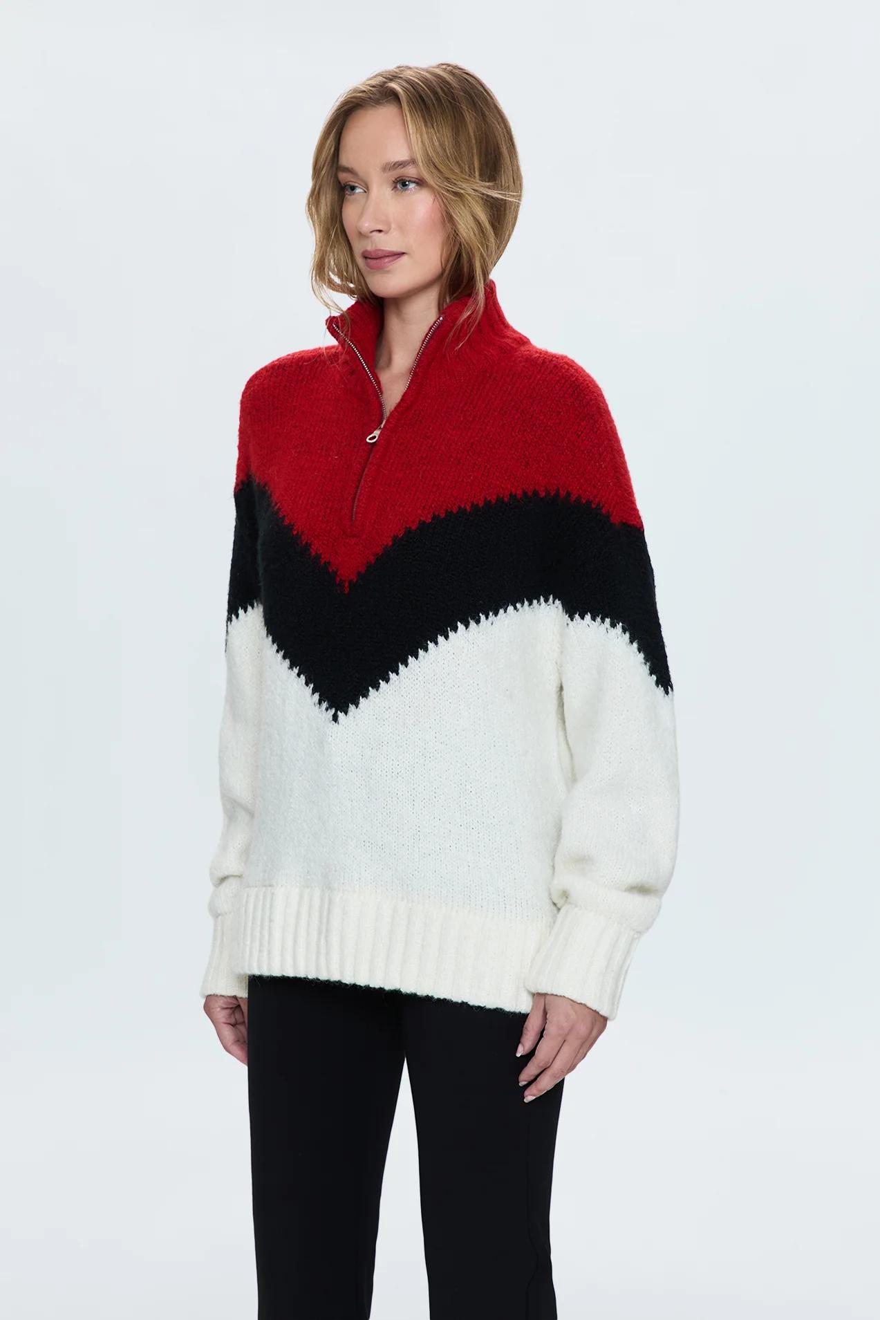 Medium weight pullover sweater with a relaxed pullover fit. With a quarter zip neckline and high sport collar. Lofty ribbing at cuffs and hem. Offered in a multi-colored red and black chevron motif over a cream white base hue.