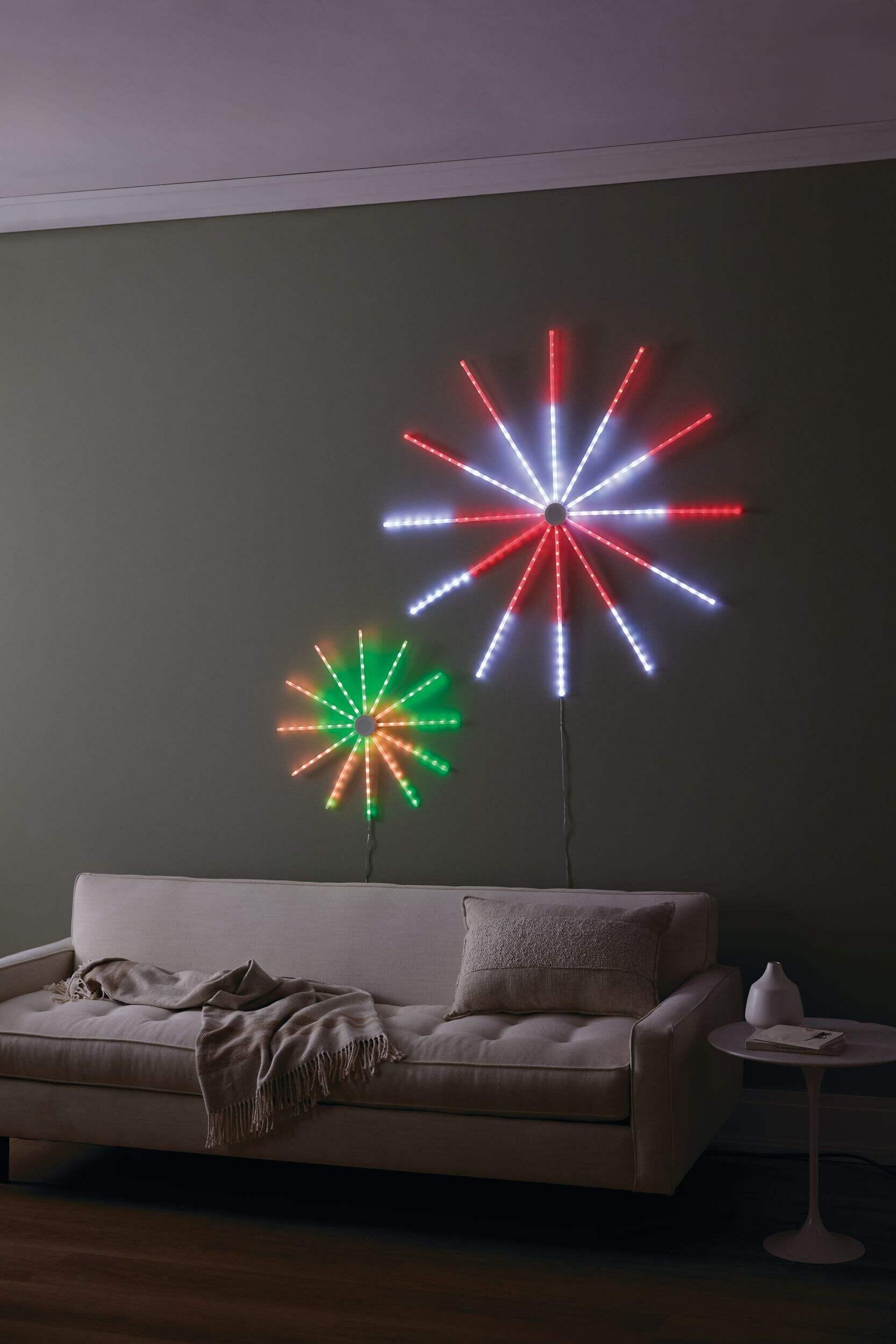 Transform your living space with the NOMA Firework Lightshow 2-Pack. The included wall lights create a stunning visual display with high visibility in both indoor and outdoor settings. With dynamic and static lighting modes controlled by a remote, you can easily customize the ambiance to suit any occasion.