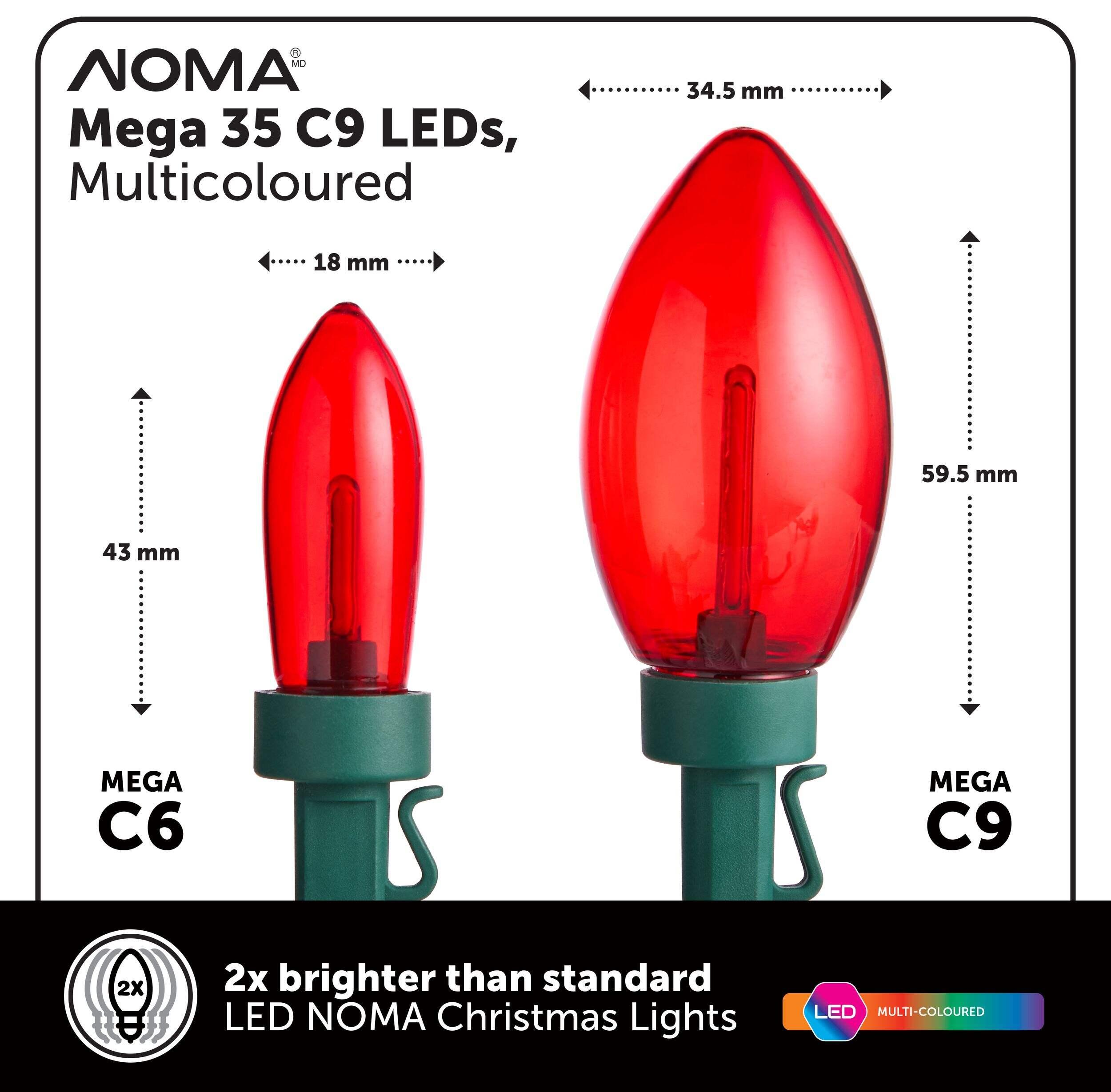 Illuminate your home with the vibrant NOMA Big & Bright C9 Multicoloured LED Lights 35-Pack. Designed for both indoor and outdoor use, these lights are 2x Brighter than our Core Noma Lights. Noma Big and Brights while having the appearance of incandescent Christmas lights are Shatterproof.