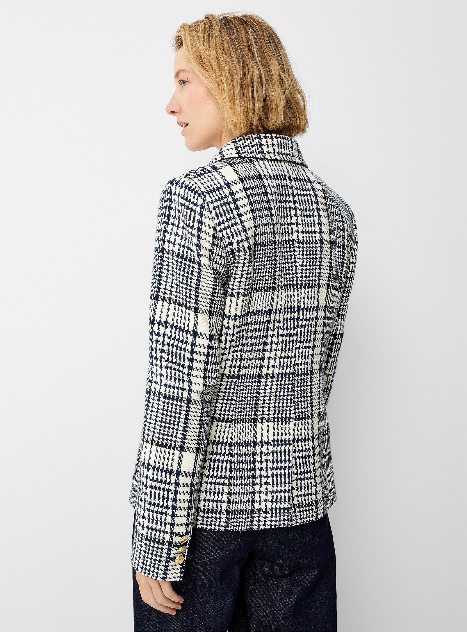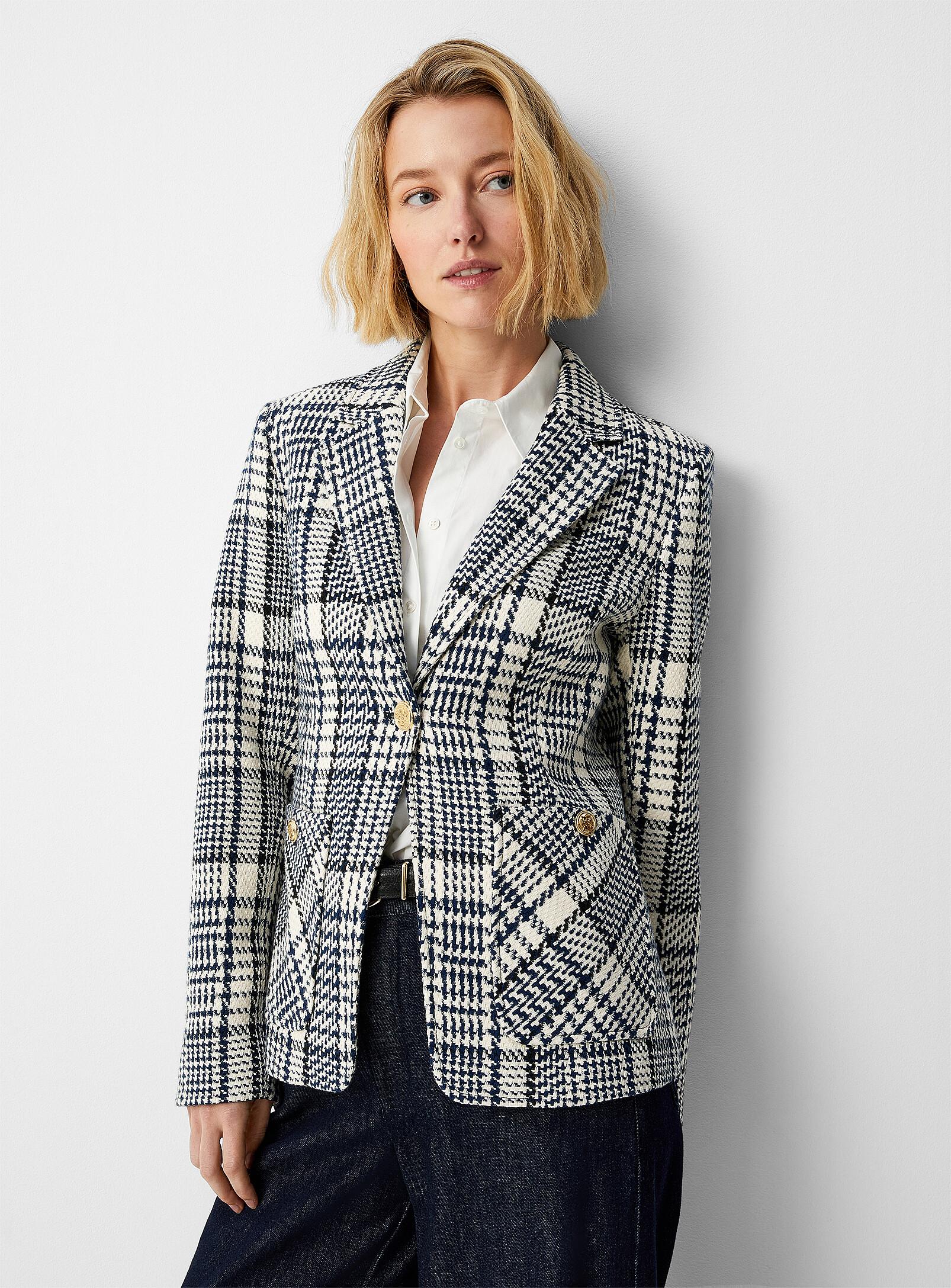 Structured 100% organic cotton knit Built-in fine satiny lining Regular fit Notch collar Single-breasted design with crest button Buttoned patch pockets Thin built-in shoulder pads Centre vent behind