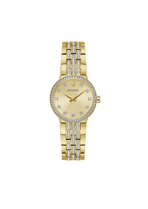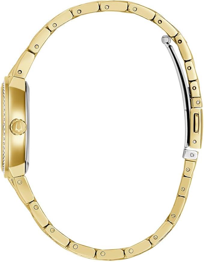 This ladies’ box set from the Bulova Crystal collection epitomizes graceful style. The gold-tone stainless steel case balances femininity and modern design with a sophisticated bezel set with crystals. The radiant champagne dial is appointed with crystal hour markers and striking gold-tone accents. Crystals on the gold-tone stainless steel bracelet complement the case and dial, while the bracelet’s foldover buckle closure with a safety and pushers ensures a perfect fit. Completing this charming box set is a cross pendant in gold-tone stainless steel, set with crystals from end-to-end. A perfectly refined ladies’ timepiece for every occasion. Disclosure: We are a participant in the Amazon Services LLC Associates Program, an affiliate advertising program designed to provide a means for us to earn fees by linking to Amazon.ca and Affiliate sites.