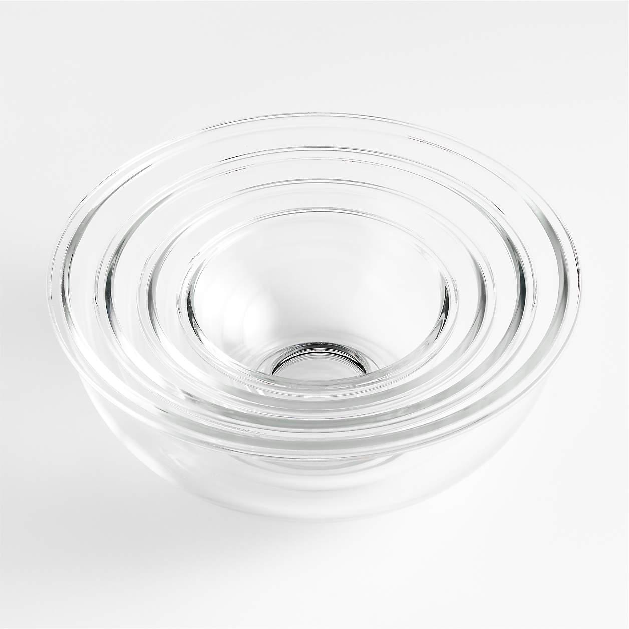 A timeless classic, glass mixing bowls are essential in the kitchen and on the table. Use this set of four to mix cake batter, proof bread dough, whip meringue and melt chocolate—or to mix and serve salads and sides. The durable borosilicate glass stands up to freezer, microwave, oven and dishwasher use, and the four bowls nest neatly for compact storage.
