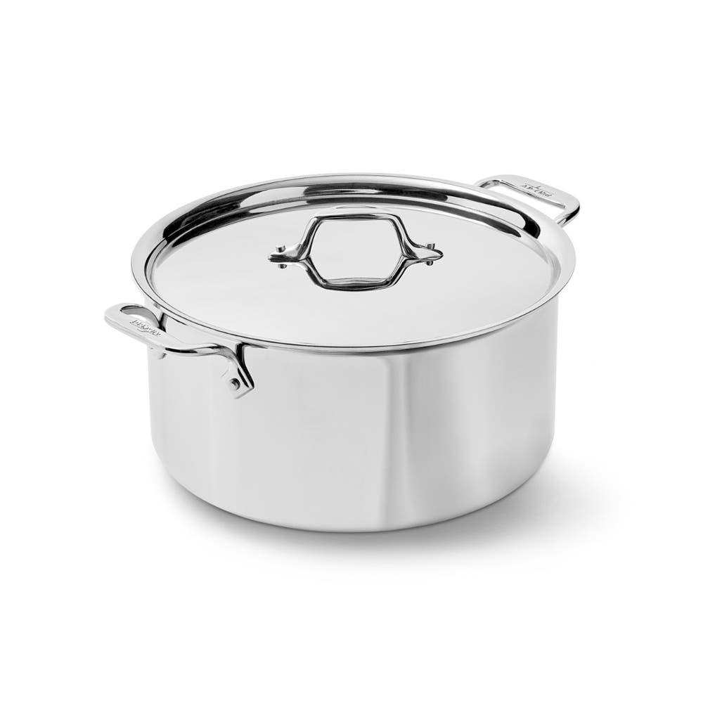 Enhance your cooking capabilities with this 8 quart covered Stockpot, featuring All-Clad's D3 tri-ply construction for superior heat distribution and precise temperature control making it ideal for simmering and boiling your favorite recipes.