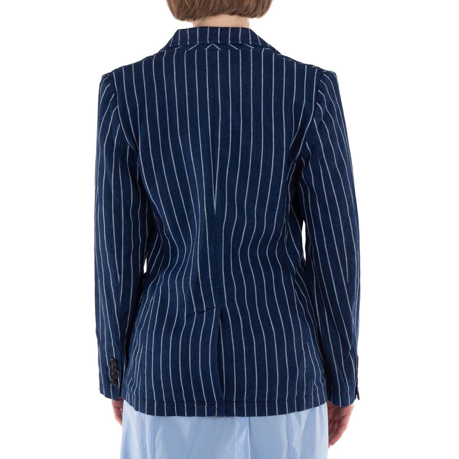 Polo Ralph Lauren Ladies Outerwear. Fashion category: Blazers. SKU: 211934940001. Color: Blue. Polo Ralph Lauren Linen-Cotton Pinstripe Blazer. Crafted from linen-cotton twill for breathability and comfort, this single-breasted jacket features a slim fit, notched lapels, structured shoulder pads, and long sleeves. 55% Linen, 45% Cotton.