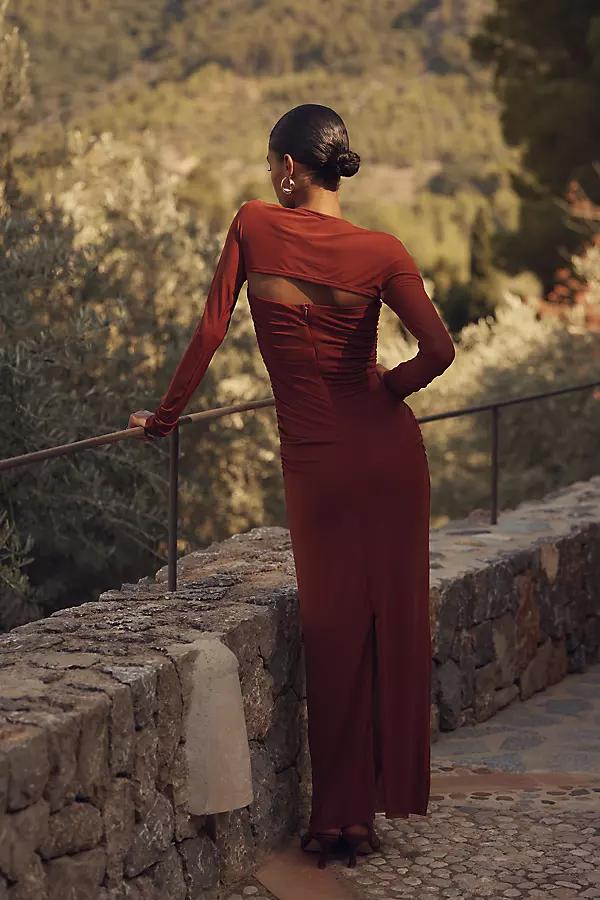 94% nylon, 6% elastane Ruched detailing Long sleeves Straight neckline Back zip Hand wash Imported Myriad Long-Sleeve Ruched Midi Dress by SOVERE in Brown, Women's, Size: XS, Nylon/Elastane at Anthropologie