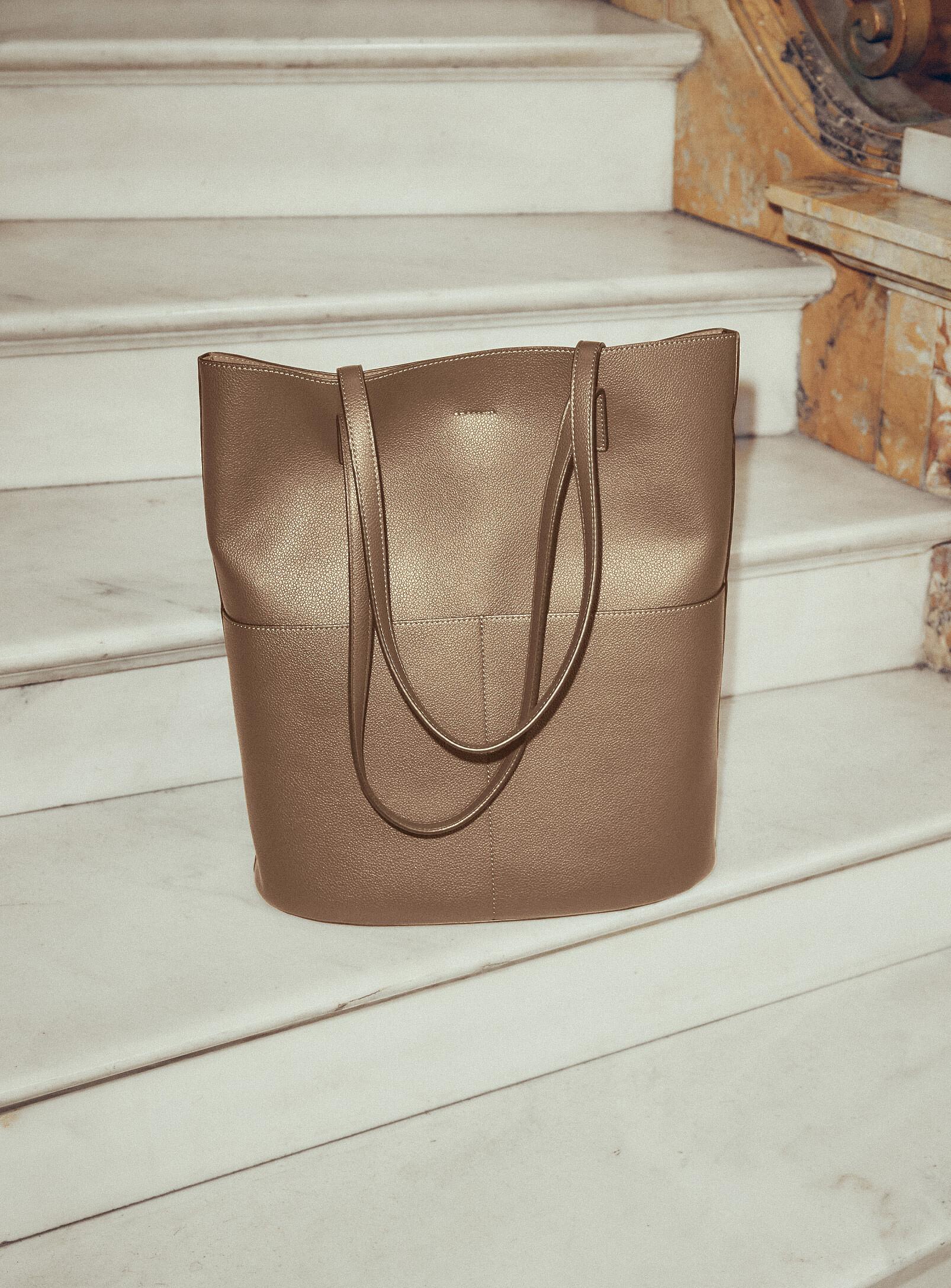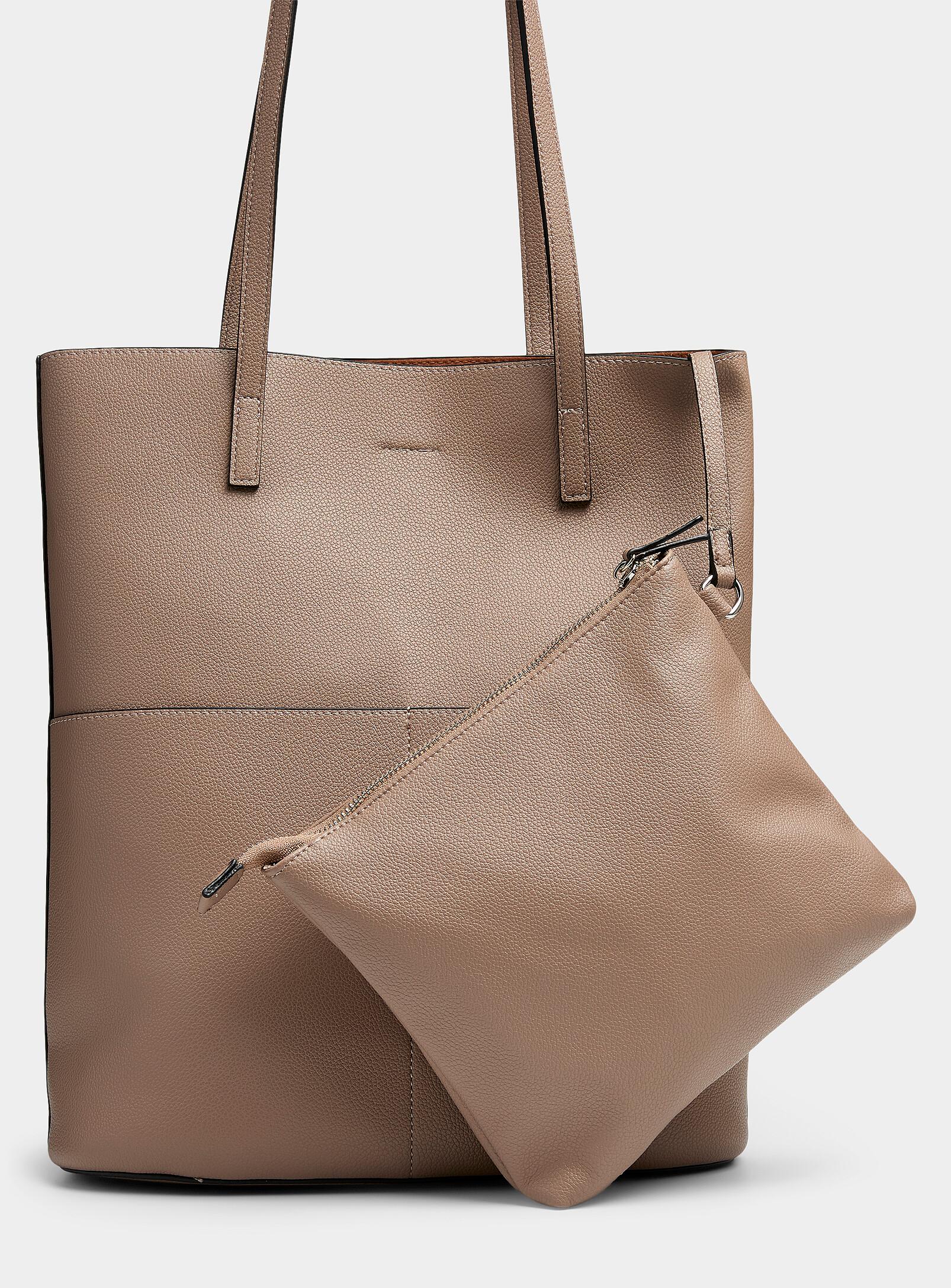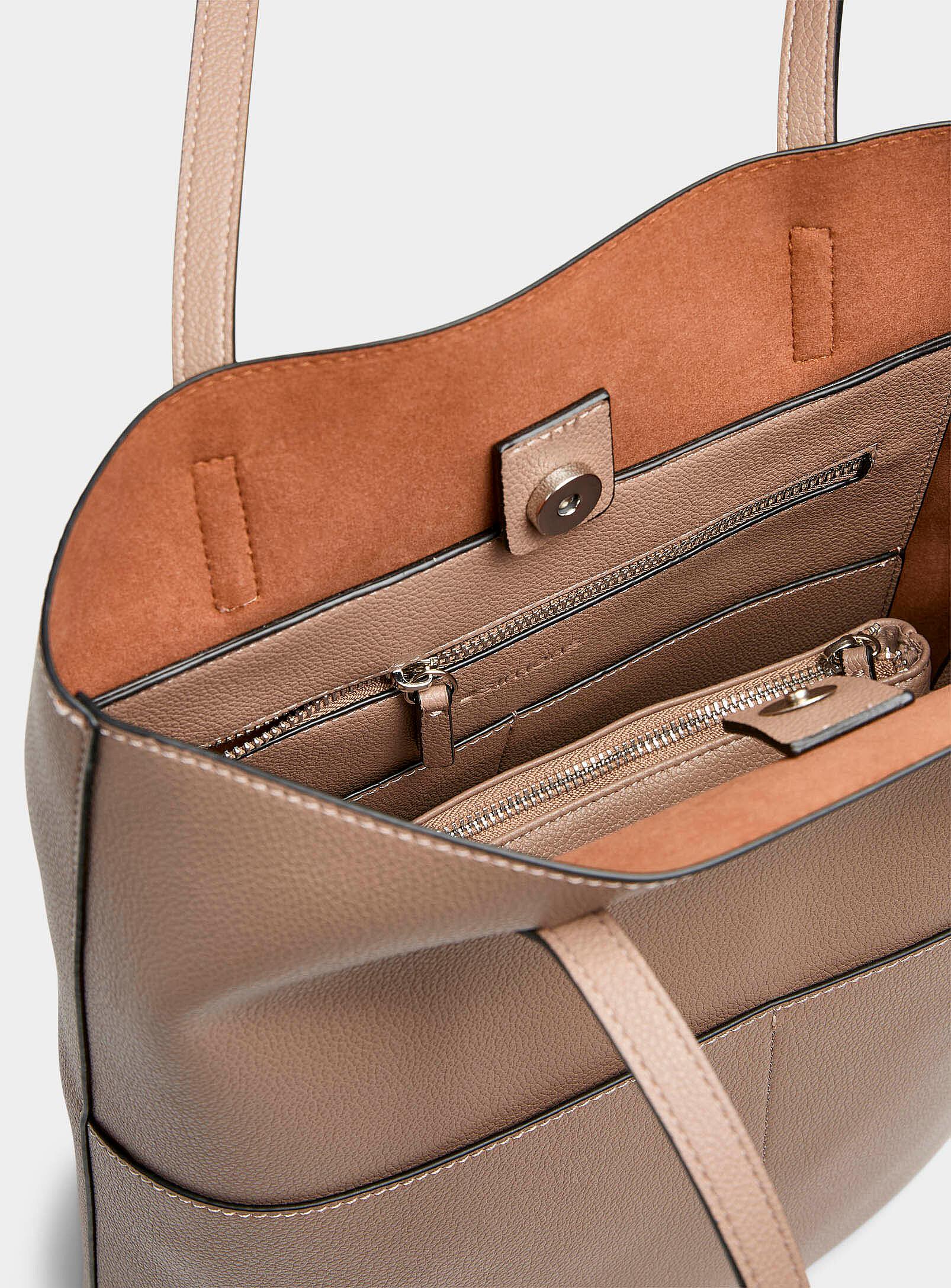 Recycled polyurethane pebbled faux leather Polyester suede lining Magnetic button closure Grab or shoulder handles Patch pockets at the front One zipped pocket and two slit pockets inside Small removable inner zip clutch