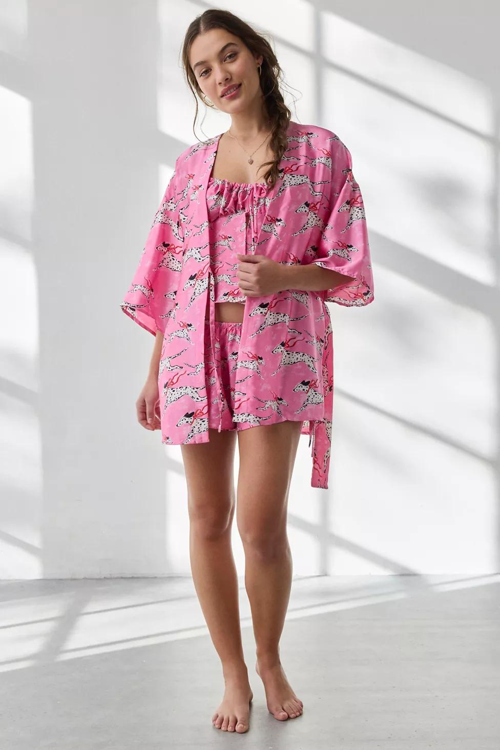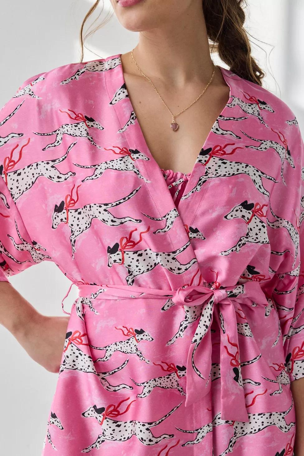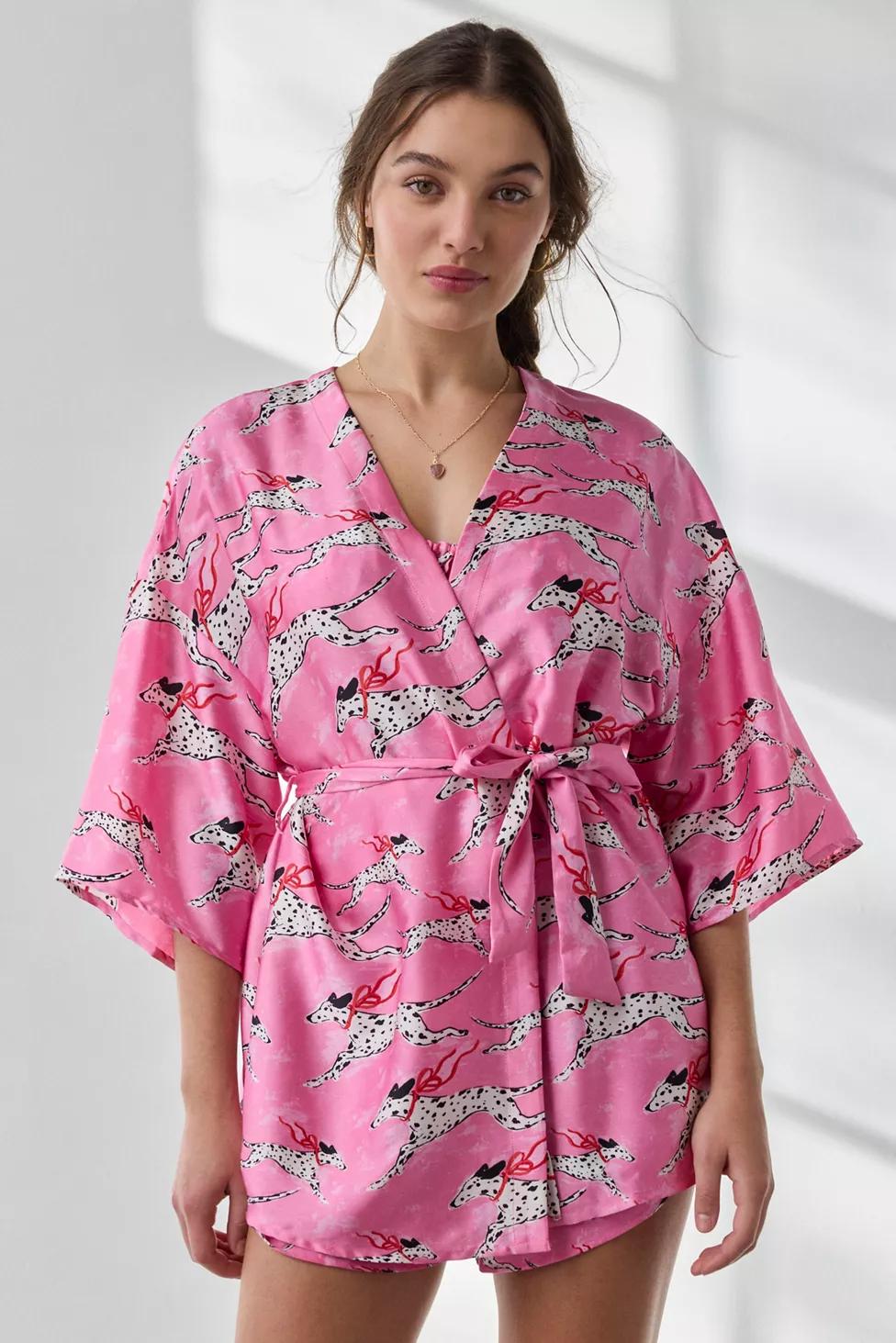 Lifestyle staple Out From Under robe in a flowing, mini silhouette. Designed in a printed, soft-touch satin featuring a plunging wrap v-neckline, 3/4 bell sleeves and a tie-waist closure. Exclusively at Urban Outfitters.