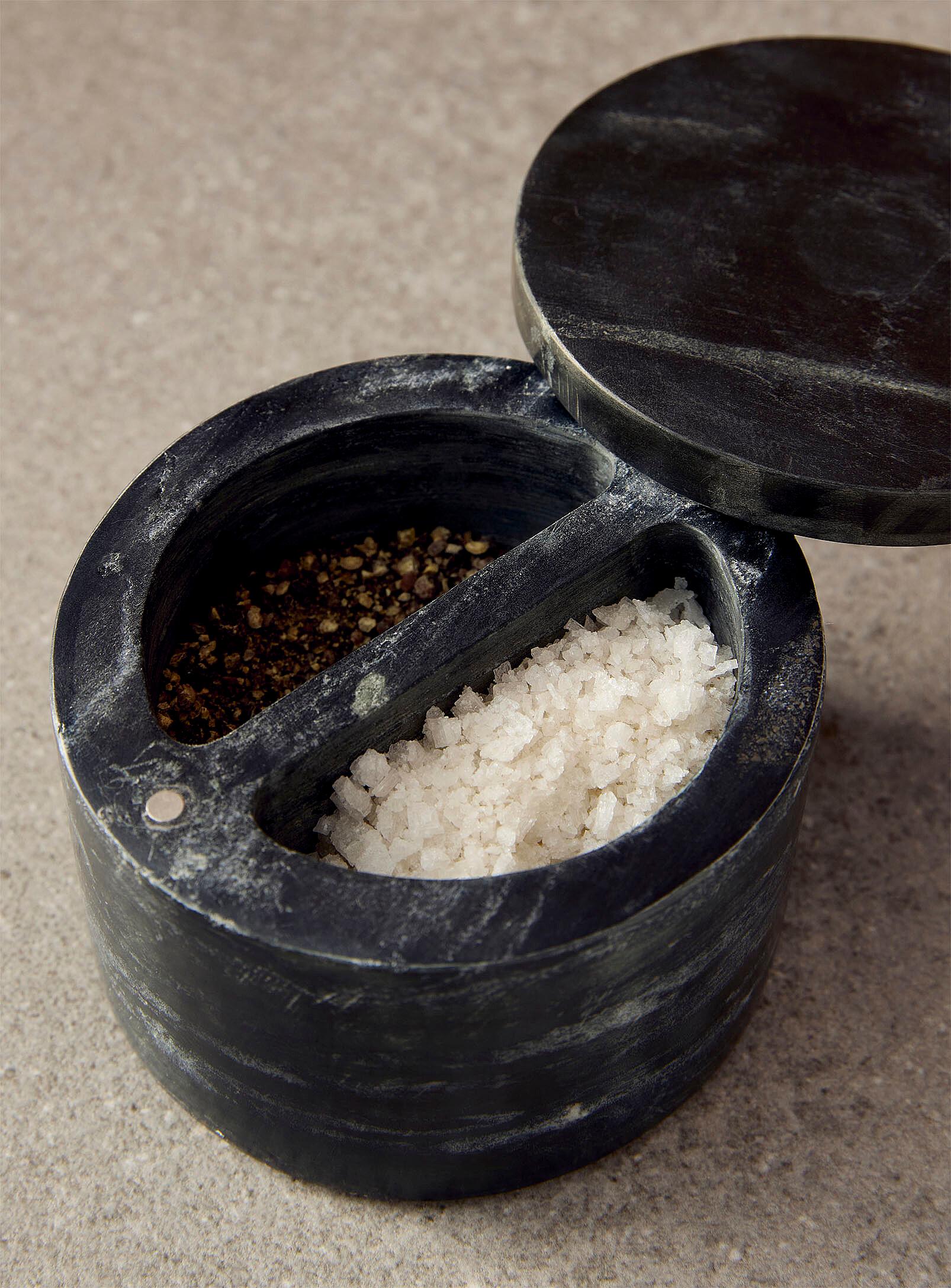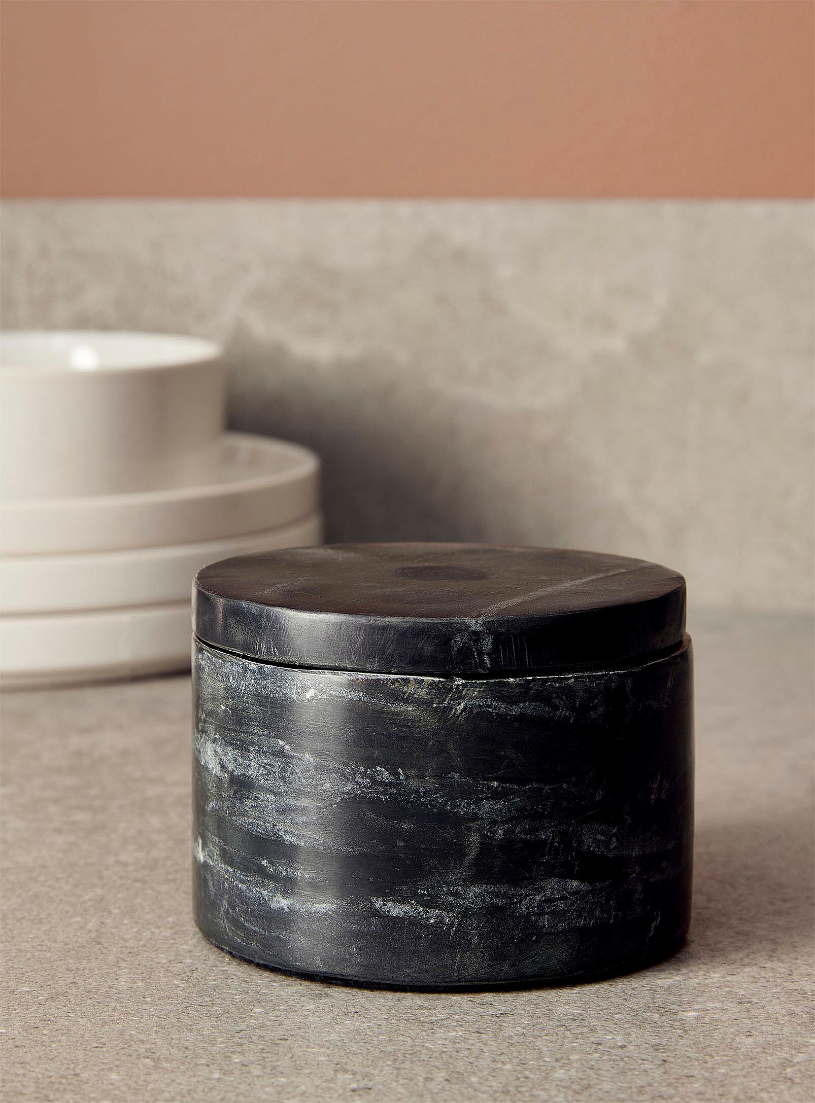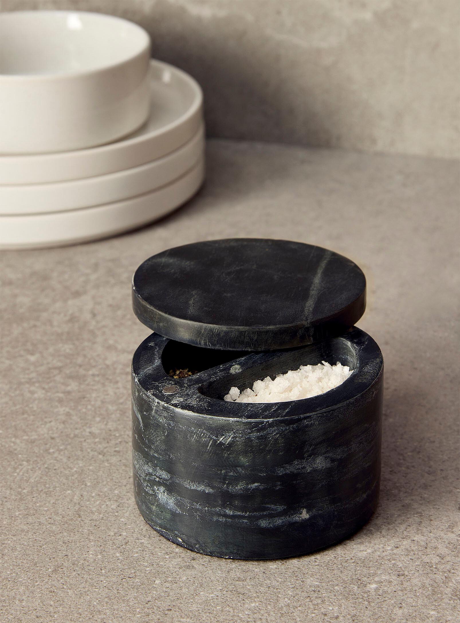 Use this pretty piece for salt, spices and other bulk foods, make it a chic catchall or store your jewellery and small objects in it to elevate your everyday routine Real marble Matching swivel lid Two main compartments Hand-wash only 4" (10 cm) in diameter x 3" (7.5 cm) high