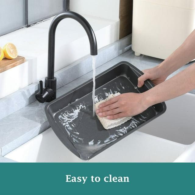 This sturdy Mainstays 6pc bakeware set features all the necessary equipment for making your favorite desserts, cookie, breads and much more. Made of reliable carbon steel, excellent heat transfer. Includes: one square pan, one roster pan, one cookie sheet, one 6-cup muffin pan and two loaf pan. So all of your baking needs are met. Non-stick coating for easy food release and effortless cleaning. Before first use and after wash use, wash pan thoroughly with mild dishwashing detergent and warm water. All of these pans nest together for convenient storage after use. This good starting over set is a wonderful present for a housewarming shower.