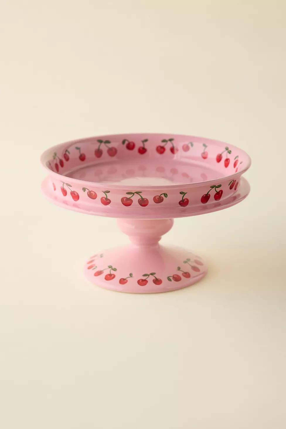 Elevate your cakes, cupcakes and other pastries with this ceramic cake stand featuring a classic silhouette with cherries painted around the platter’s rim and base. Available exclusively at Urban Outfitters.