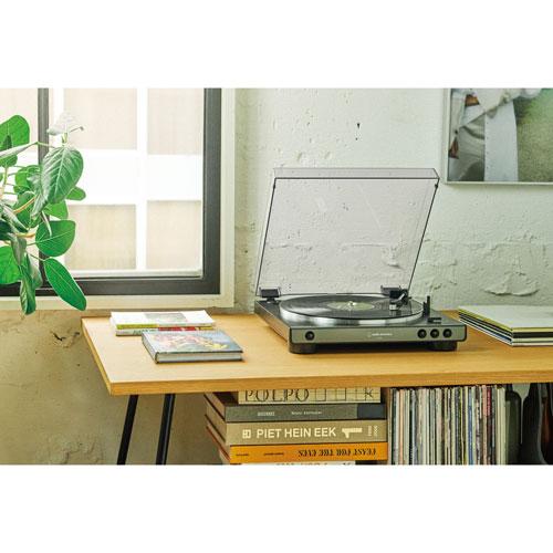 Break out your beloved record collection and play it on the Audio Technica AT-LP60X-GM belt-drive turntable. This automatic turntable plays both 33-1/3 RPM and 45 RPM records and boasts a built-in preamp so you can connect it directly to your stereo system, computer, and other components--even if they don't have a dedicated phono input.