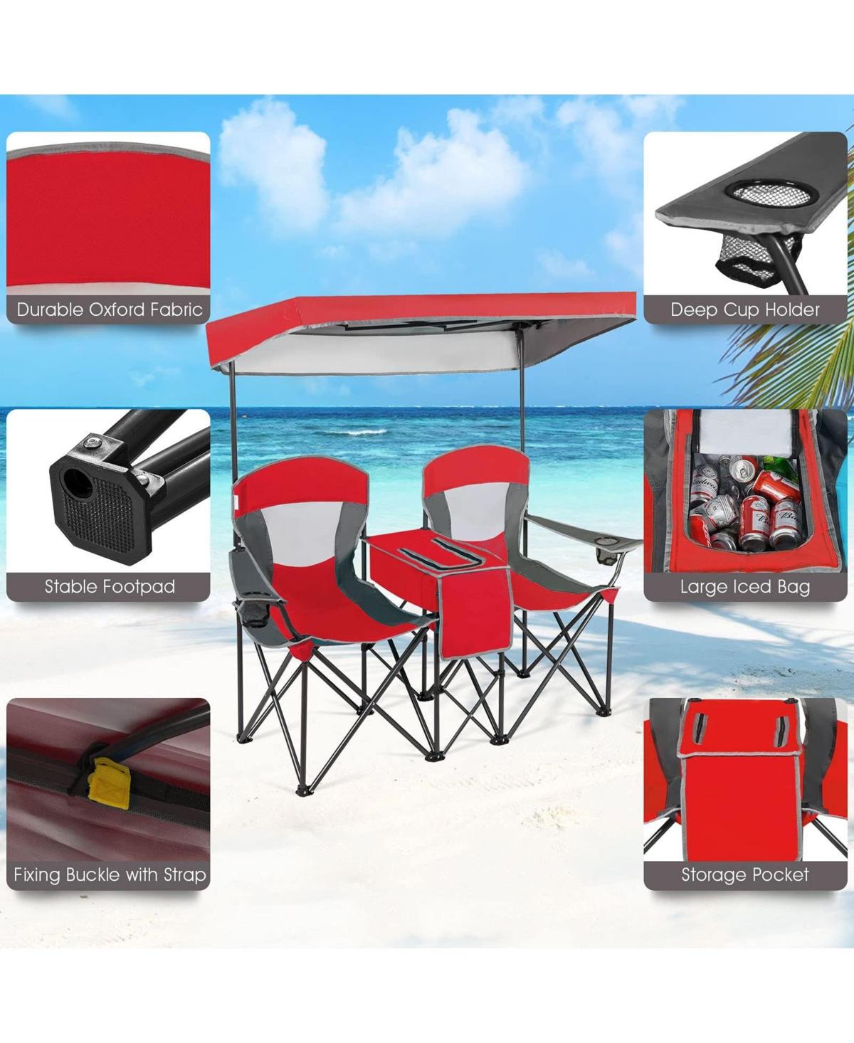 Discover ultimate outdoor comfort with our double folding chair, crafted from durable, black powder-coated steel and breathable oxford cloth. This chair features an adjustable canopy, a built-in cooler, and cup holders, making it perfect for any outdoor setting. Its sturdy construction supports up to 265 lbs per seat, and the foldable design with a carrying bag offers easy storage and portability. Ideal for parks, beaches, or backyard gatherings, it provides a comfortable, shaded spot to relax.