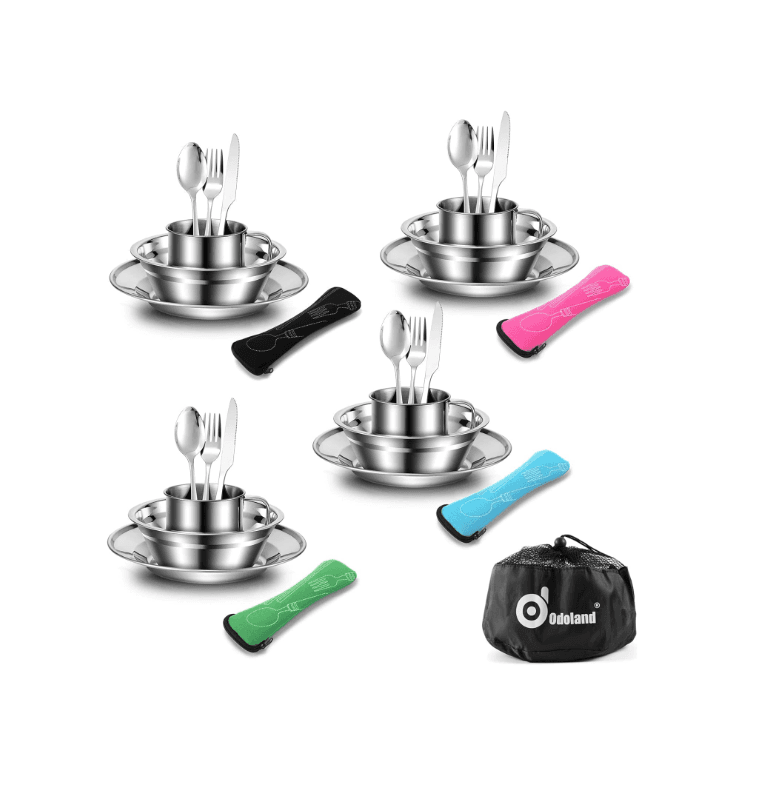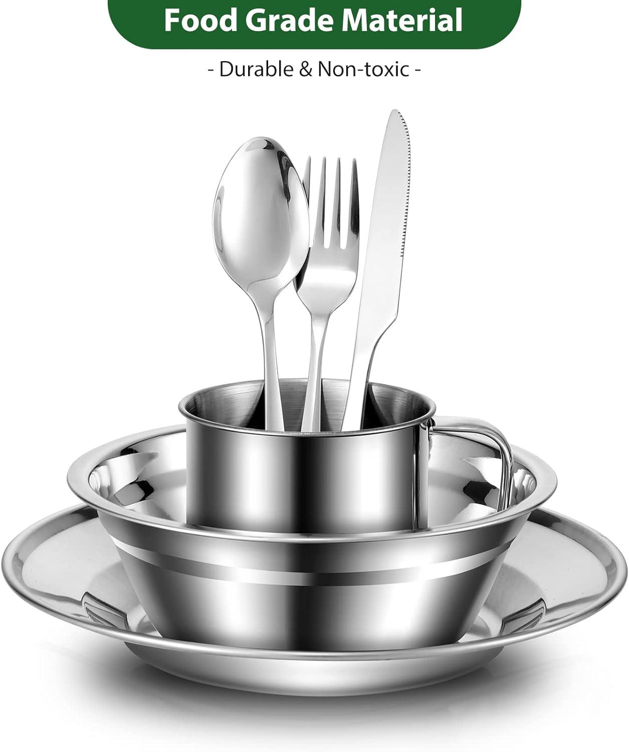 A COMPLETE SET YOU NEED: This camping mess kit includes 29pcs essentials. 4 x 6.3'' bowls,4 x 8'' dinner plates, 4 x 10oz cups, 4 x dinner cutlery set (4 x forks, 4 x spoons, 4 x knives) with cases, 1 x food grade mesh bag. Disclosure: We are a participant in the Amazon Services LLC Associates Program, an affiliate advertising program designed to provide a means for us to earn fees by linking to Amazon.ca and Affiliate sites.